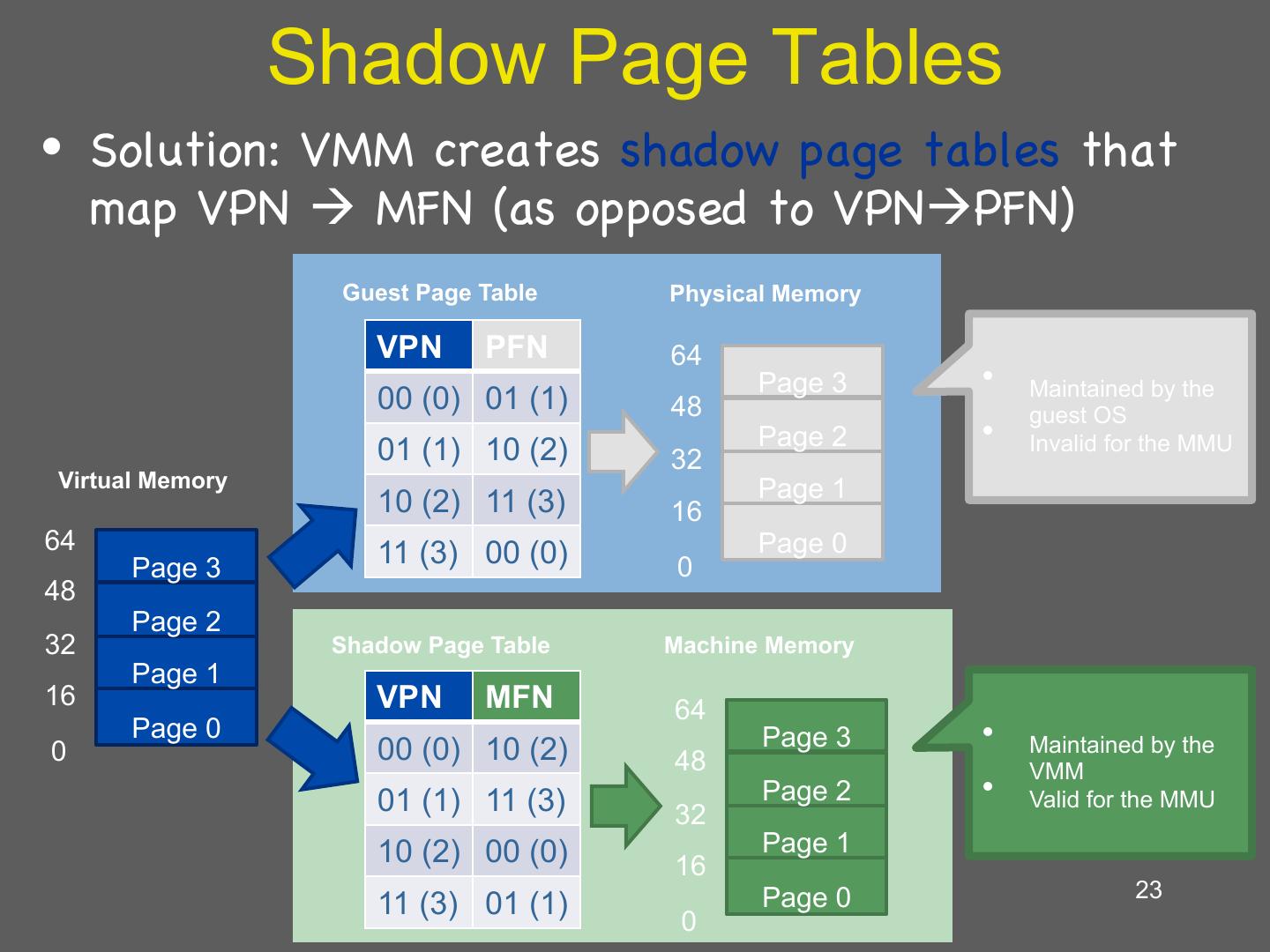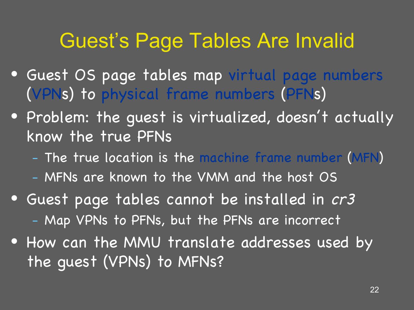 22 . Guest’s Page Tables Are Invalid • Guest OS page tables map virtual page numbers (VPNs) to physical frame numbers (PFNs) • Problem: the guest is virtualized, doesn’t actually know the true PFNs – The true location is the machine frame number (MFN) – MFNs are known to the VMM and the host OS • Guest page tables cannot be installed in cr3 – Map VPNs to PFNs, but the PFNs are incorrect • How can the MMU translate addresses used by the guest (VPNs) to MFNs? 22