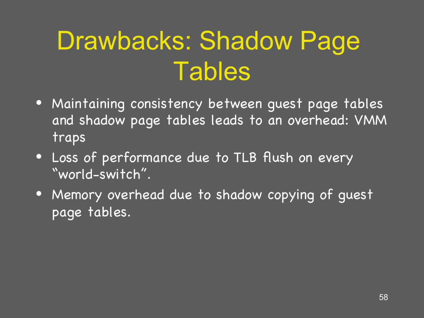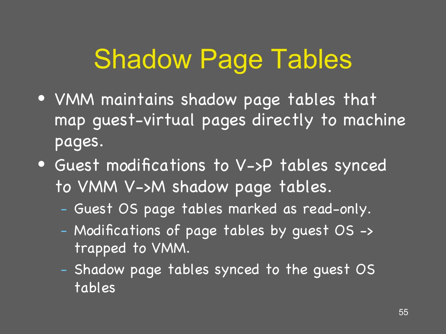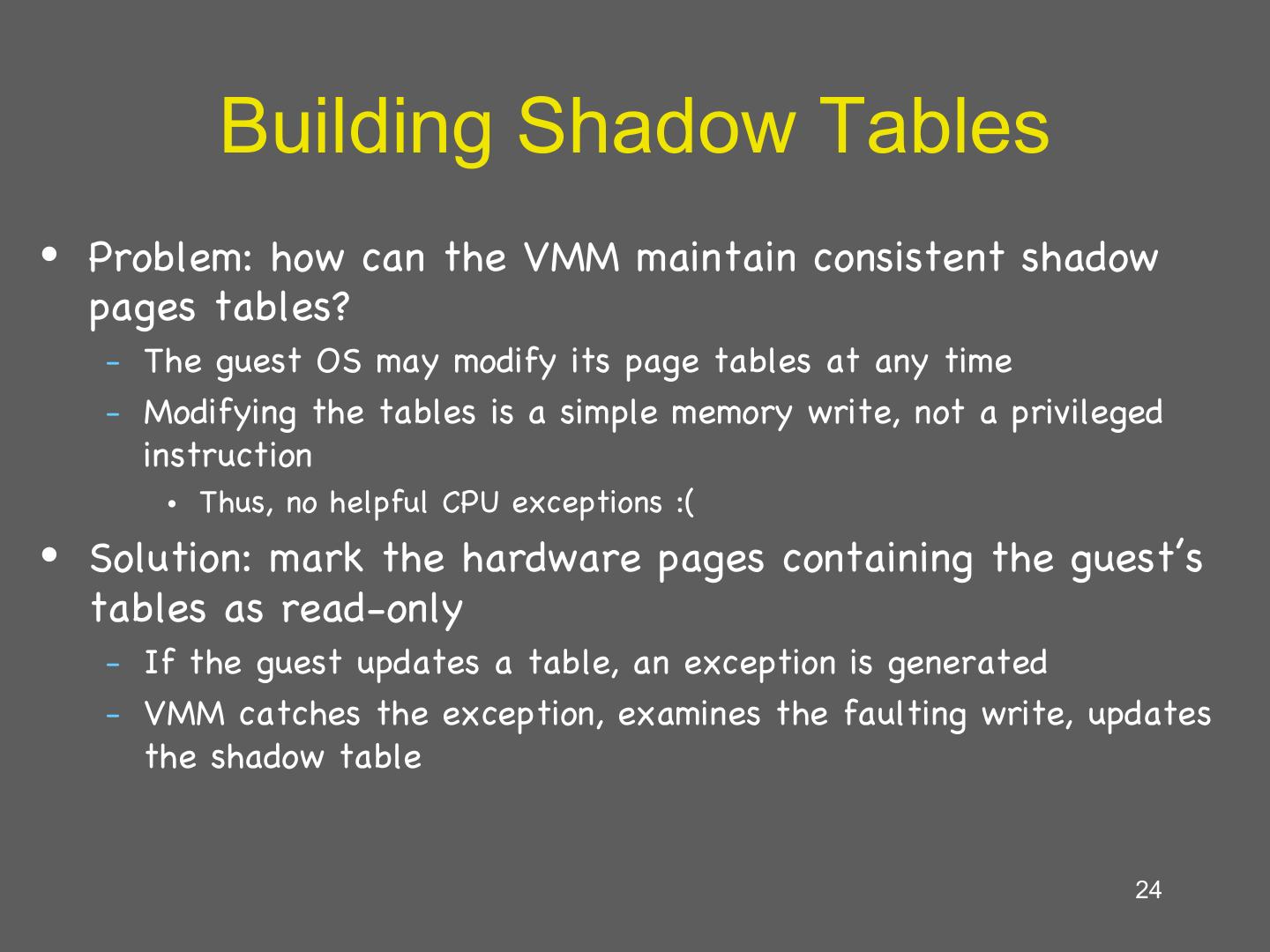 24 . Building Shadow Tables • Problem: how can the VMM maintain consistent shadow pages tables? – The guest OS may modify its page tables at any time – Modifying the tables is a simple memory write, not a privileged instruction • Thus, no helpful CPU exceptions :( • Solution: mark the hardware pages containing the guest’s tables as read-only – If the guest updates a table, an exception is generated – VMM catches the exception, examines the faulting write, updates the shadow table 24