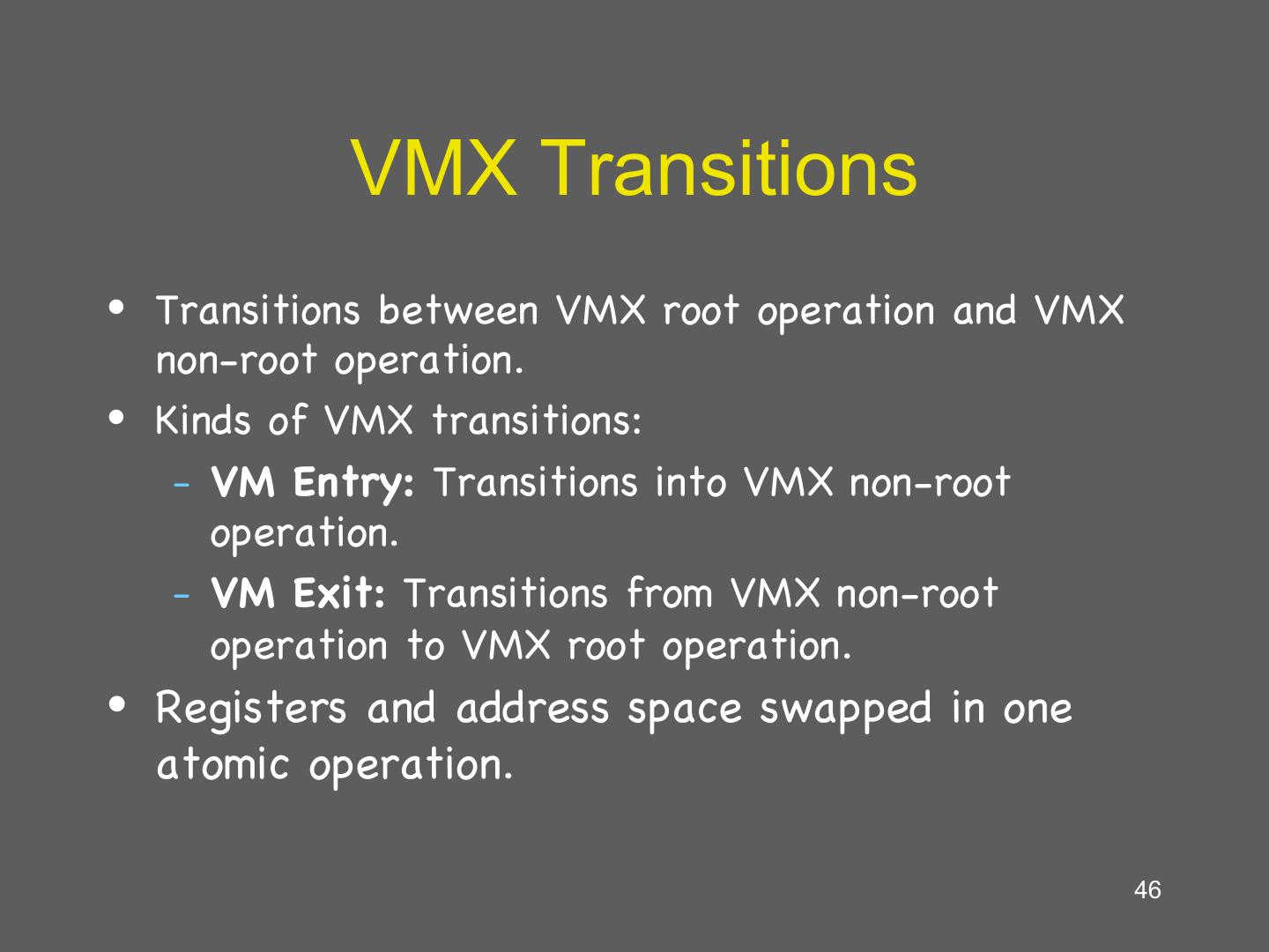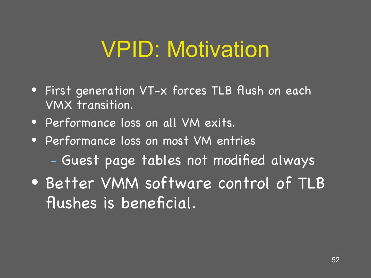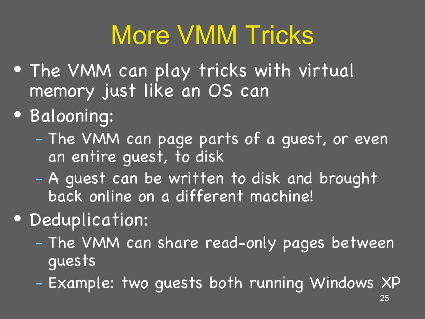 25 . More VMM Tricks • The VMM can play tricks with virtual memory just like an OS can • Balooning: – The VMM can page parts of a guest, or even an entire guest, to disk – A guest can be written to disk and brought back online on a different machine! • Deduplication: – The VMM can share read-only pages between guests – Example: two guests both running Windows XP 25