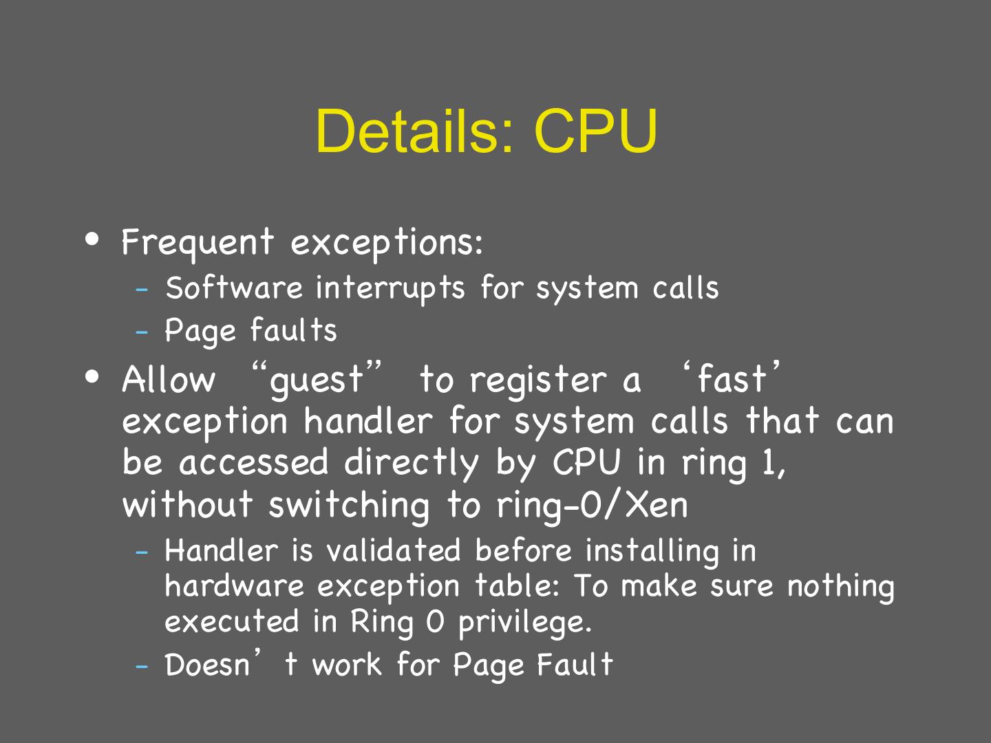 27 . Details: CPU • Frequent exceptions: – Software interrupts for system calls – Page faults • Allow “guest” to register a ‘fast’ exception handler for system calls that can be accessed directly by CPU in ring 1, without switching to ring-0/Xen – Handler is validated before installing in hardware exception table: To make sure nothing executed in Ring 0 privilege. – Doesn’t work for Page Fault