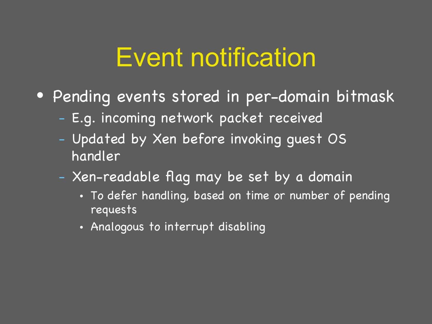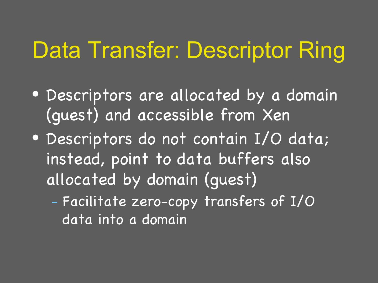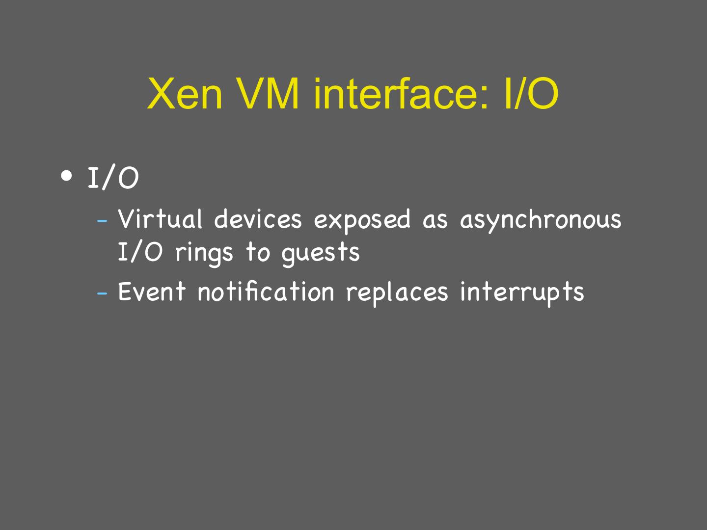 28 . Xen VM interface: I/O • I/O – Virtualdevices exposed as asynchronous I/O rings to guests – Event notification replaces interrupts