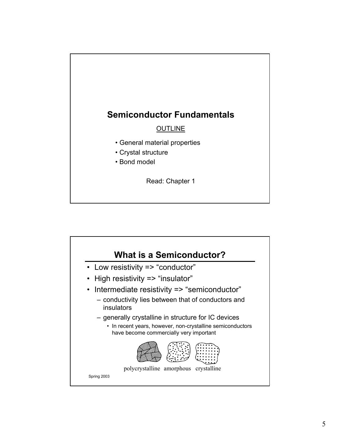 5 . Semiconductor Fundamentals OUTLINE • General material properties • Crystal structure • Bond model Read: Chapter 1 What is a Semiconductor? • Low resistivity => “conductor” • High resistivity => “insulator” • Intermediate resistivity => “semiconductor” – conductivity lies between that of conductors and insulators – generally crystalline in structure for IC devices • In recent years, however, non-crystalline semiconductors have become commercially very important polycrystalline amorphous crystalline Spring 2003 5