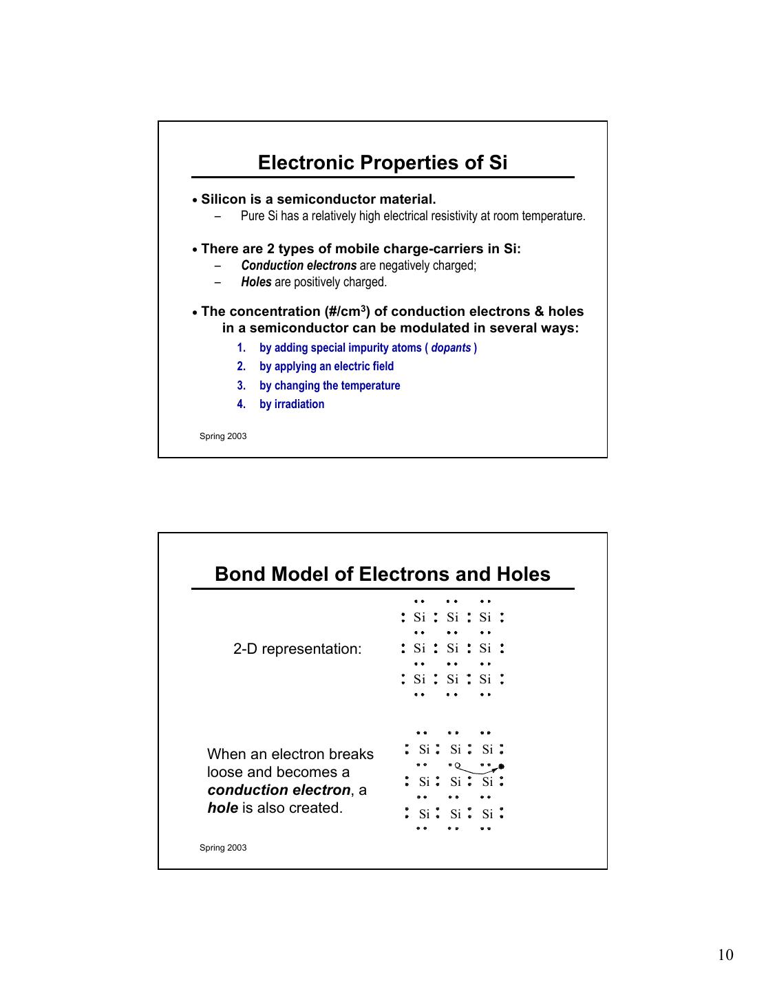 12 . Pure Si conduction ni ≅ 1010 cm-3 at room temperature Spring 2003 Summary • Crystalline Si: – 4 valence electrons per atom – diamond lattice: each atom has 4 nearest neighbors – 5 x 1022 atoms/cm3 • In a pure Si crystal, conduction electrons and holes are formed in pairs. – Holes can be considered as positively charged mobile particles which exist inside a semiconductor. – Both holes and electrons can conduct current. Spring 2003 12
