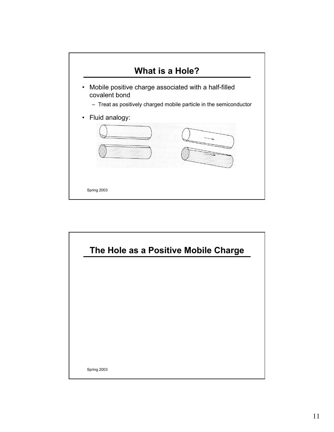 11 . What is a Hole? • Mobile positive charge associated with a half-filled covalent bond – Treat as positively charged mobile particle in the semiconductor • Fluid analogy: Spring 2003 The Hole as a Positive Mobile Charge Spring 2003 11