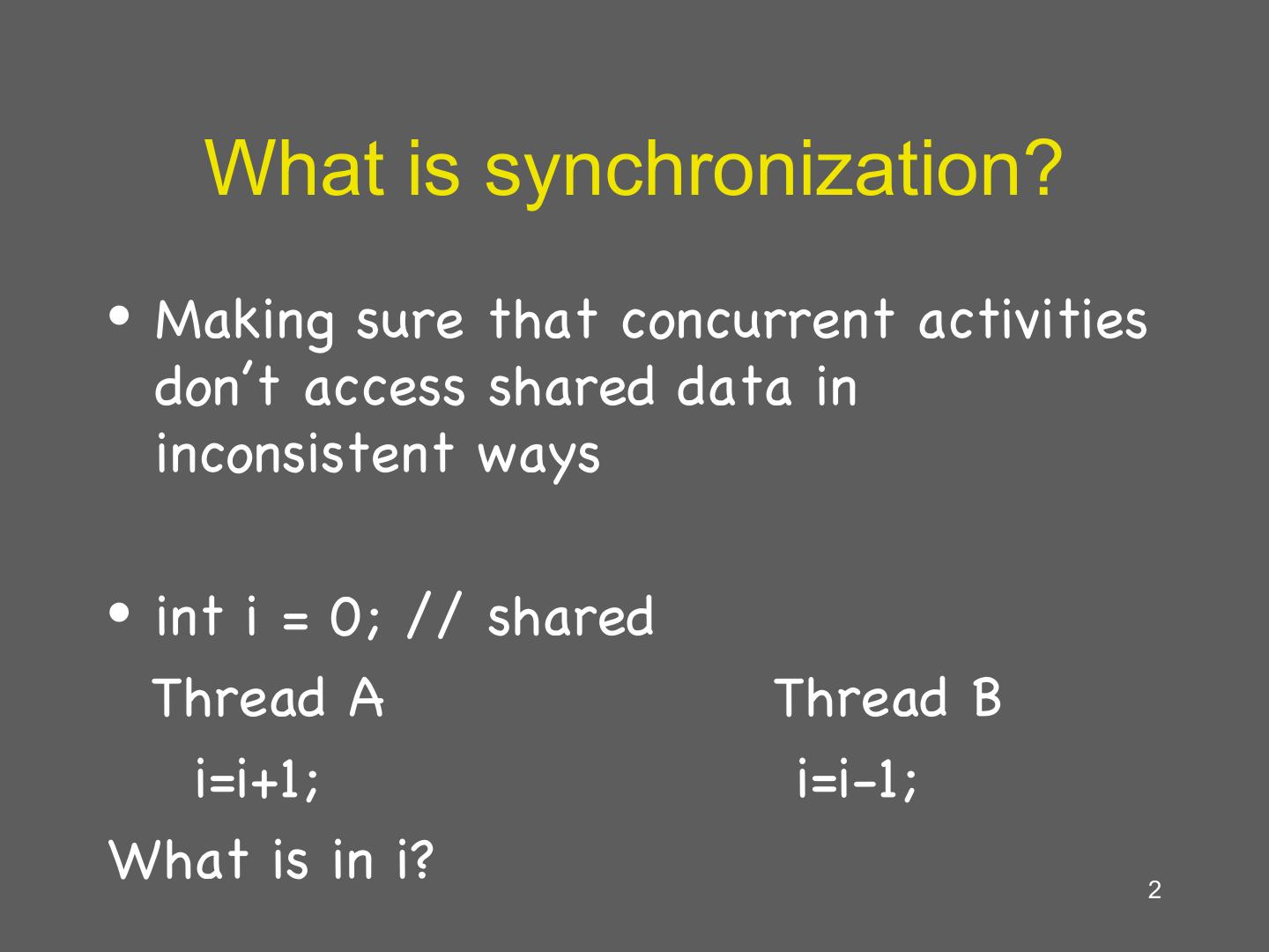 2 . What is synchronization? • Making sure that concurrent activities don’t access shared data in inconsistent ways • int i = 0; // shared Thread A Thread B i=i+1; i=i-1; What is in i? 2