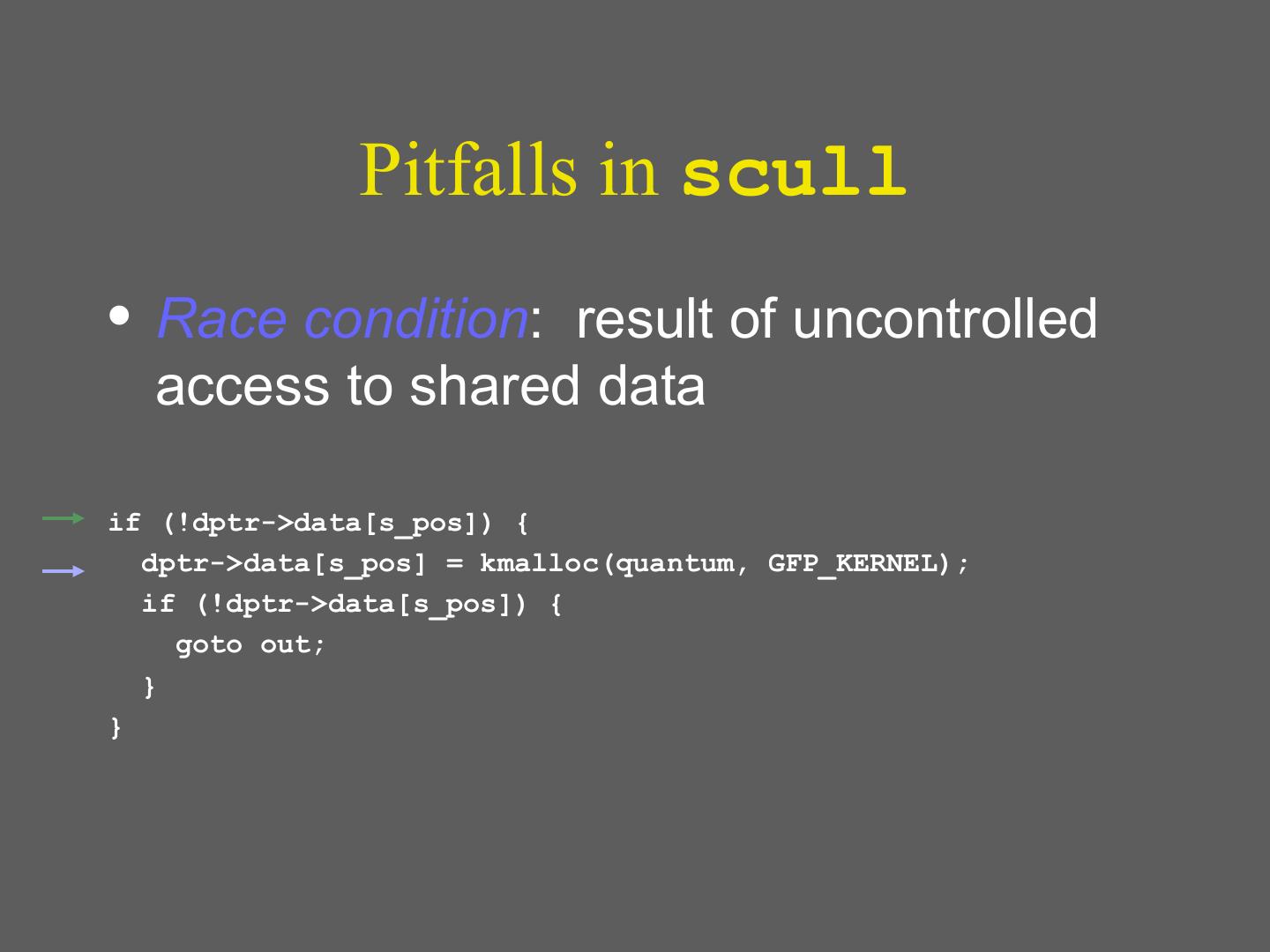 7 . Pitfalls in scull • Race condition: result of uncontrolled access to shared data if (!dptr->data[s_pos]) { dptr->data[s_pos] = kmalloc(quantum, GFP_KERNEL); Memory leak if (!dptr->data[s_pos]) { goto out; } }