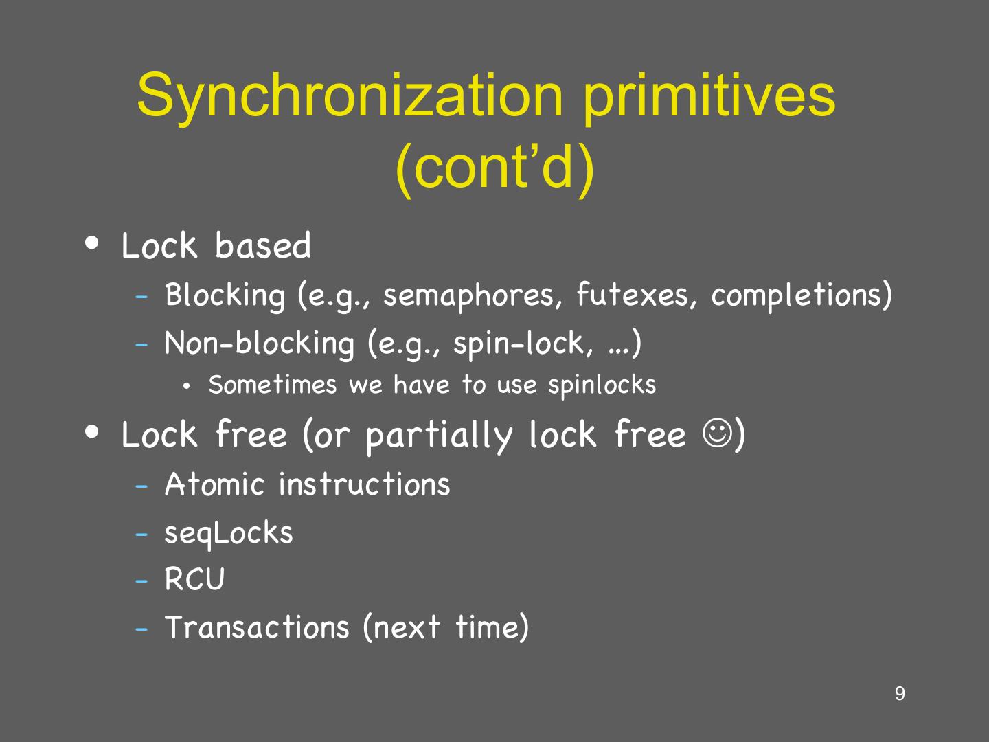 9 . Synchronization primitives (cont’d) • Lock based – Blocking (e.g., semaphores, futexes, completions) – Non-blocking (e.g., spin-lock, …) • Sometimes we have to use spinlocks • Lock free (or partially lock free J) – Atomic instructions – seqLocks – RCU – Transactions (next time) 9