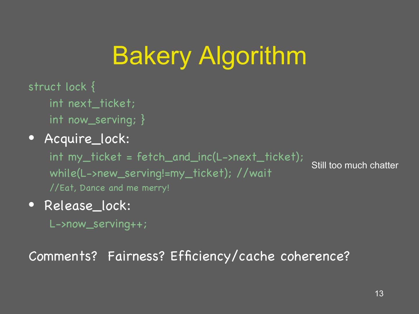 13 . Bakery Algorithm struct lock { int next_ticket; int now_serving; } • Acquire_lock: int my_ticket = fetch_and_inc(L->next_ticket); Still too much chatter while(L->new_serving!=my_ticket); //wait //Eat, Dance and me merry! • Release_lock: L->now_serving++; Comments? Fairness? Efficiency/cache coherence? 13