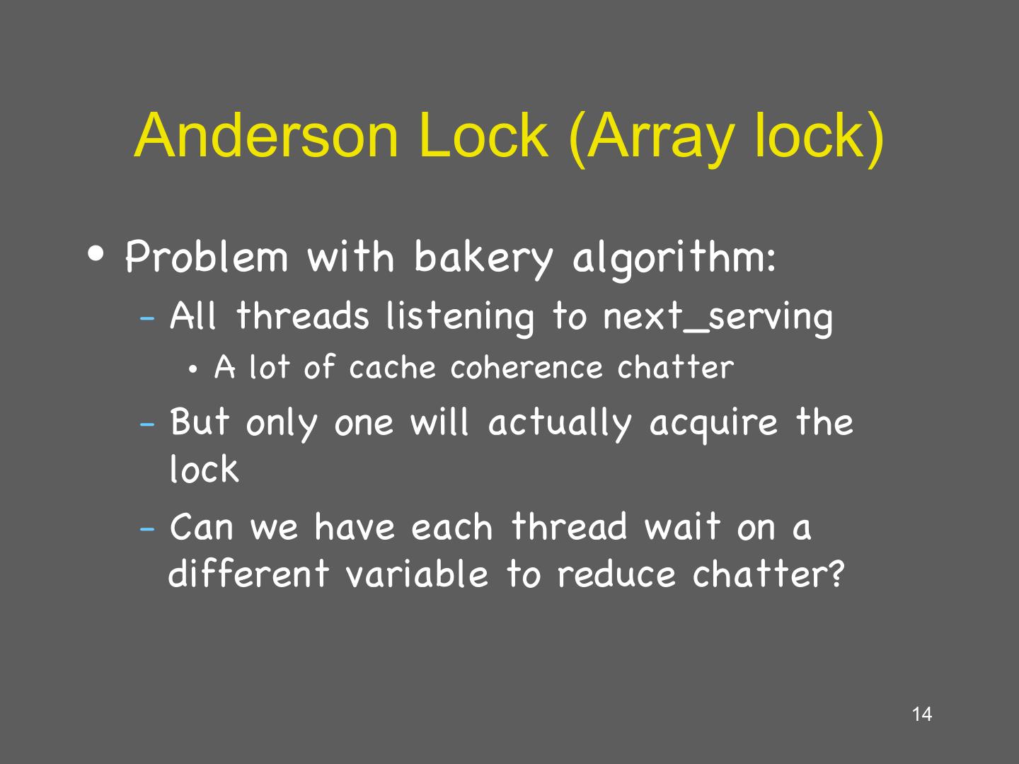 14 . Anderson Lock (Array lock) • Problem with bakery algorithm: – All threads listening to next_serving • A lot of cache coherence chatter – But only one will actually acquire the lock – Can we have each thread wait on a different variable to reduce chatter? 14