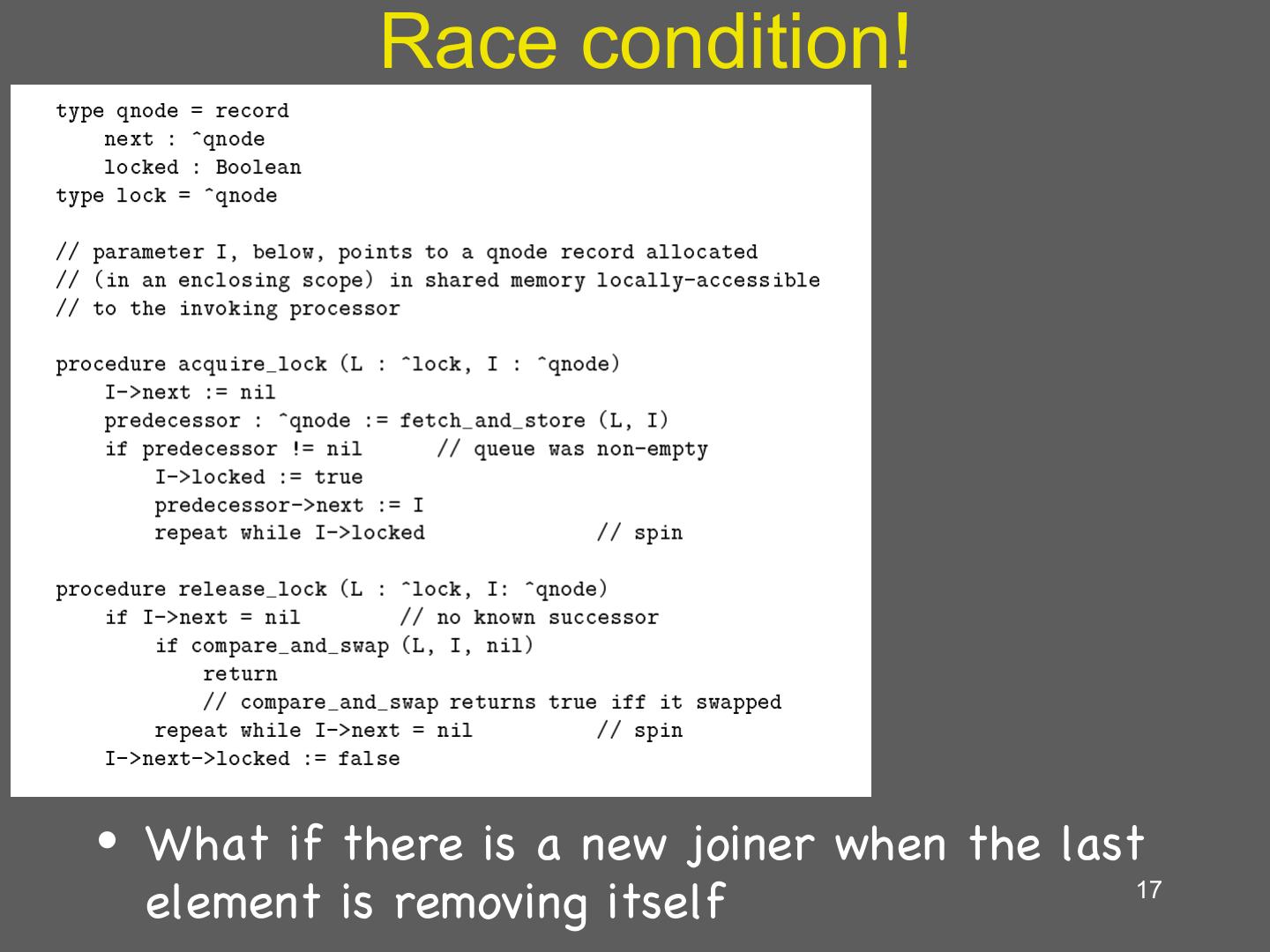 17 . Race condition! • What if there is a new joiner when the last element is removing itself 17
