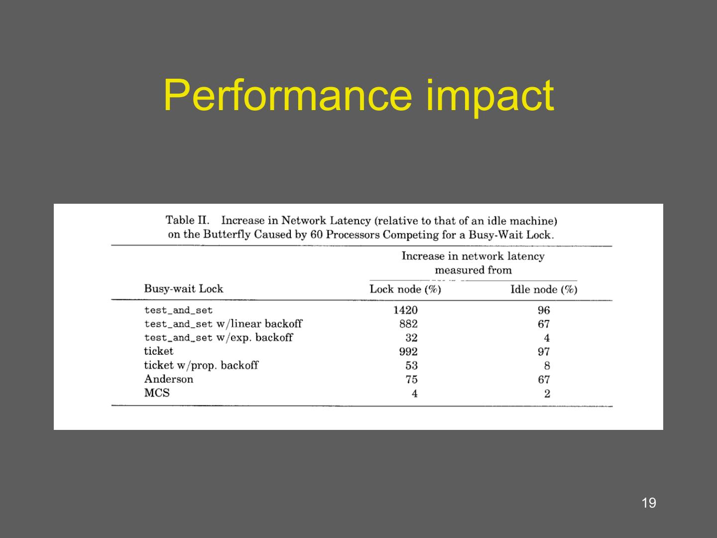 15 . Anderson’s Lock • We have an array (actually circular queue) of variables – Each variable can indicate either lock available or waiting for lock • Only one location has lock available Lock(L): my_place = fetch_and_inc (queuelast); while (flags[myplace mod N] == must_wait); Unlock(L) flags[myplace mod N] = must_wait; flags[mypalce+1 mod N] = available; Fair and not noisy – compare to spin-on-read and bakery algorithm 15 Any negative side effects?