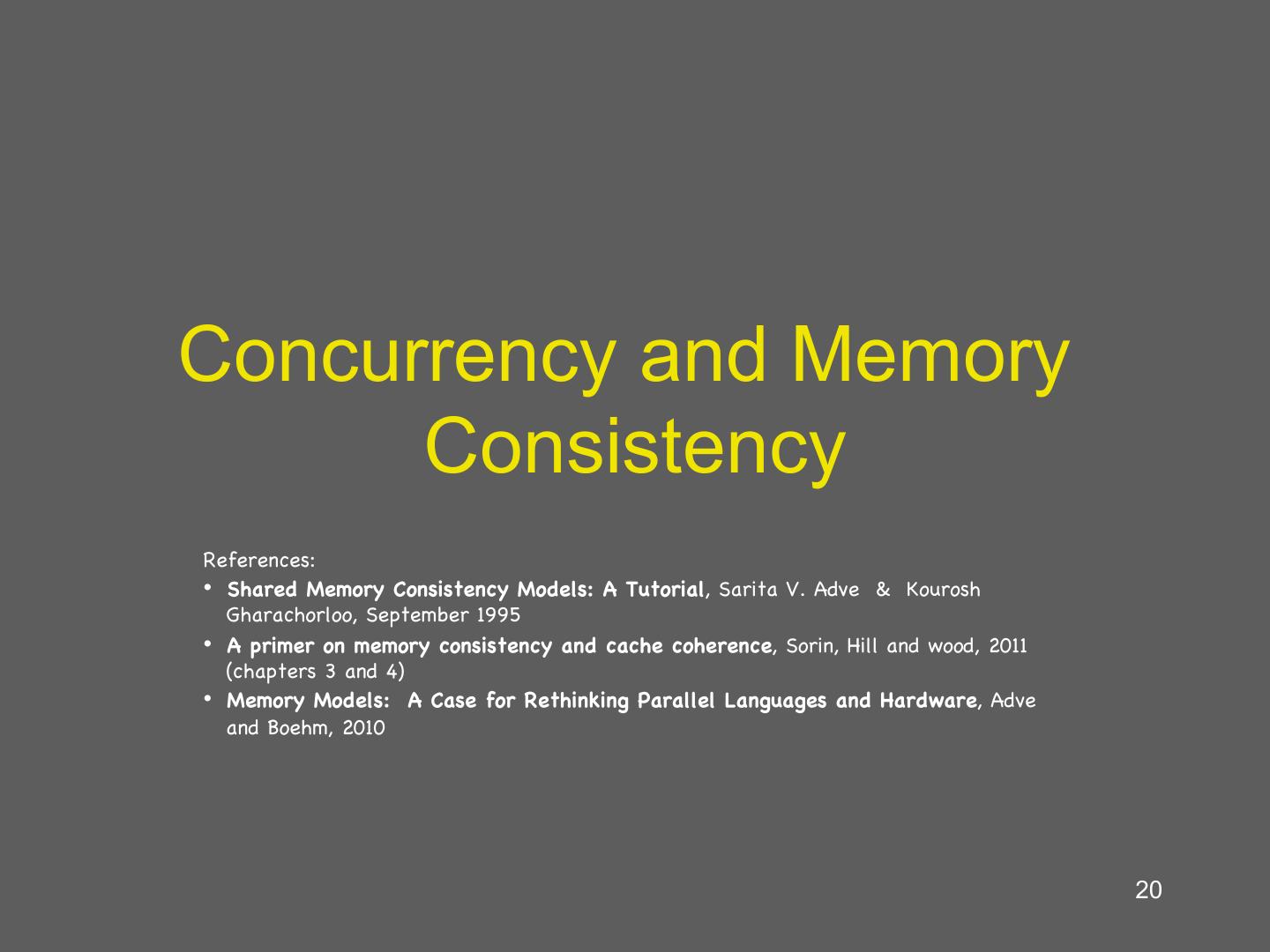 20 .Concurrency and Memory Consistency References: • Shared Memory Consistency Models: A Tutorial, Sarita V. Adve & Kourosh Gharachorloo, September 1995 • A primer on memory consistency and cache coherence, Sorin, Hill and wood, 2011 (chapters 3 and 4) • Memory Models: A Case for Rethinking Parallel Languages and Hardware, Adve and Boehm, 2010 20
