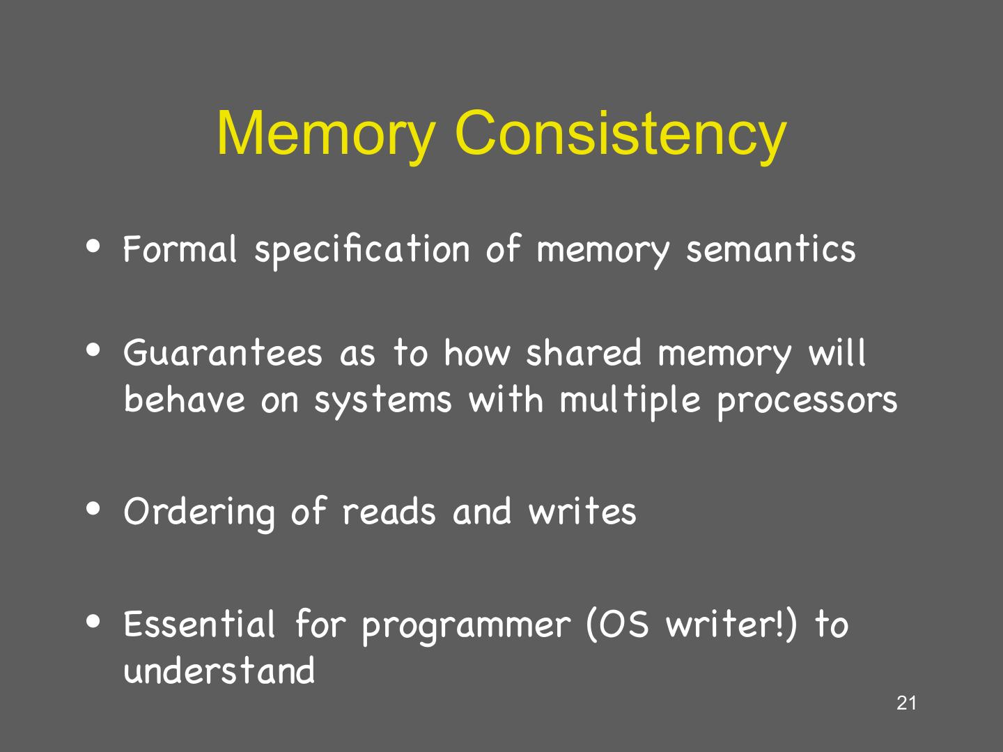21 . Memory Consistency • Formal specification of memory semantics • Guarantees as to how shared memory will behave on systems with multiple processors • Ordering of reads and writes • Essential for programmer (OS writer!) to understand 21