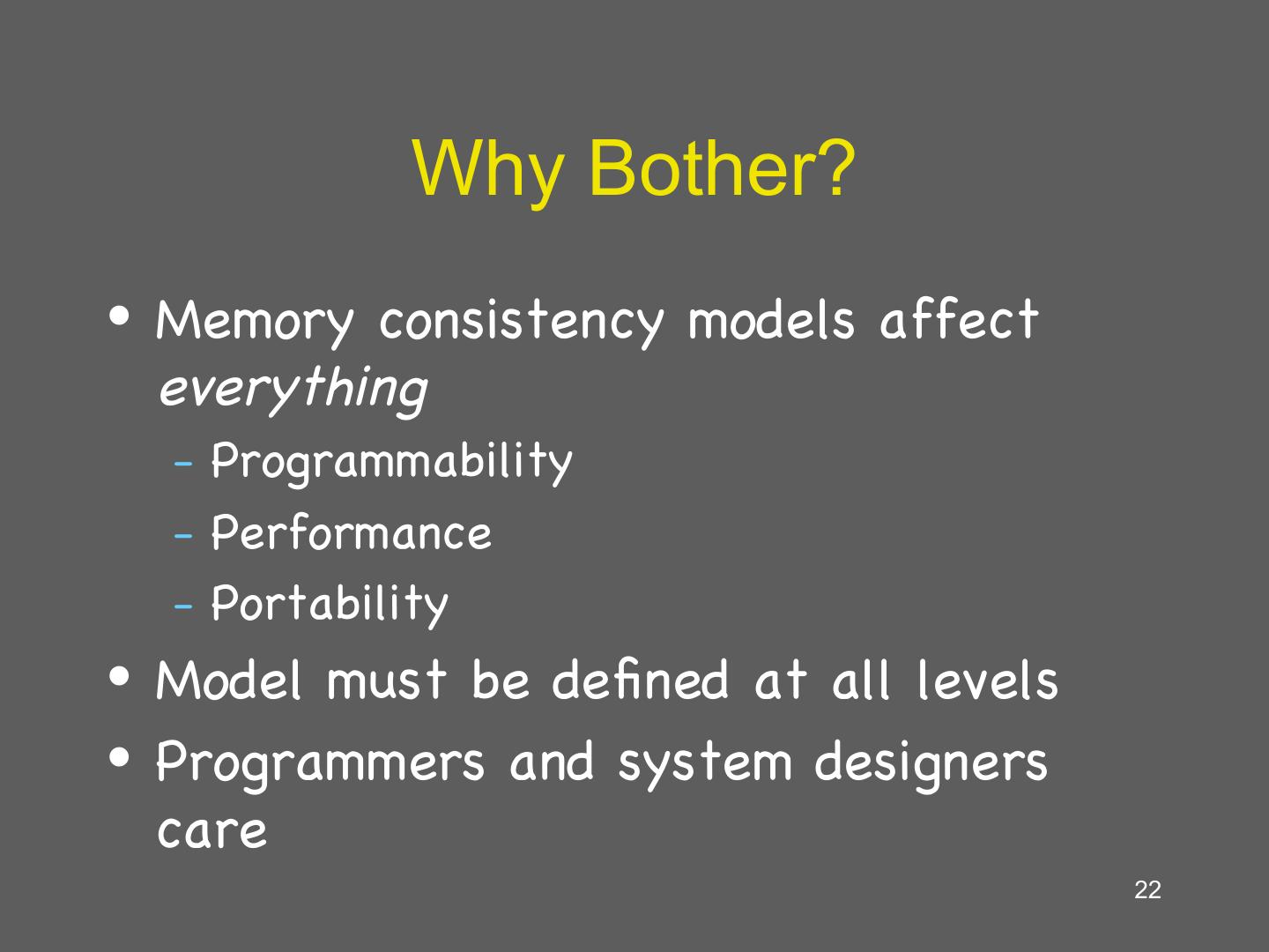 22 . Why Bother? • Memory consistency models affect everything – Programmability – Performance – Portability • Model must be defined at all levels • Programmers and system designers care 22