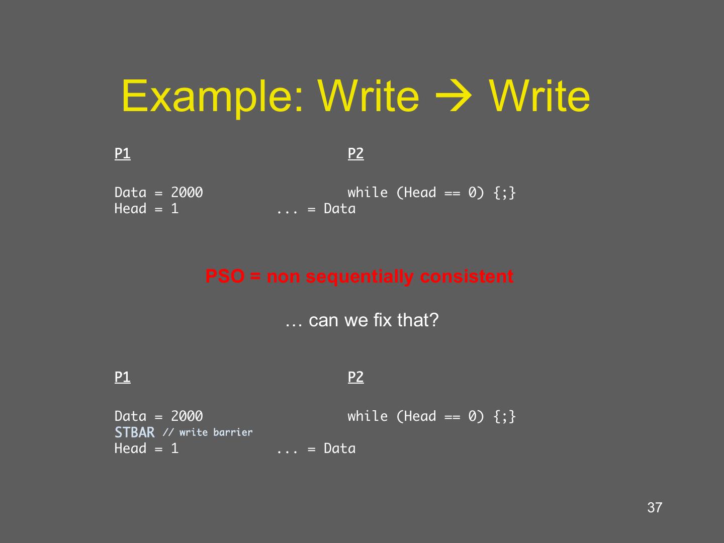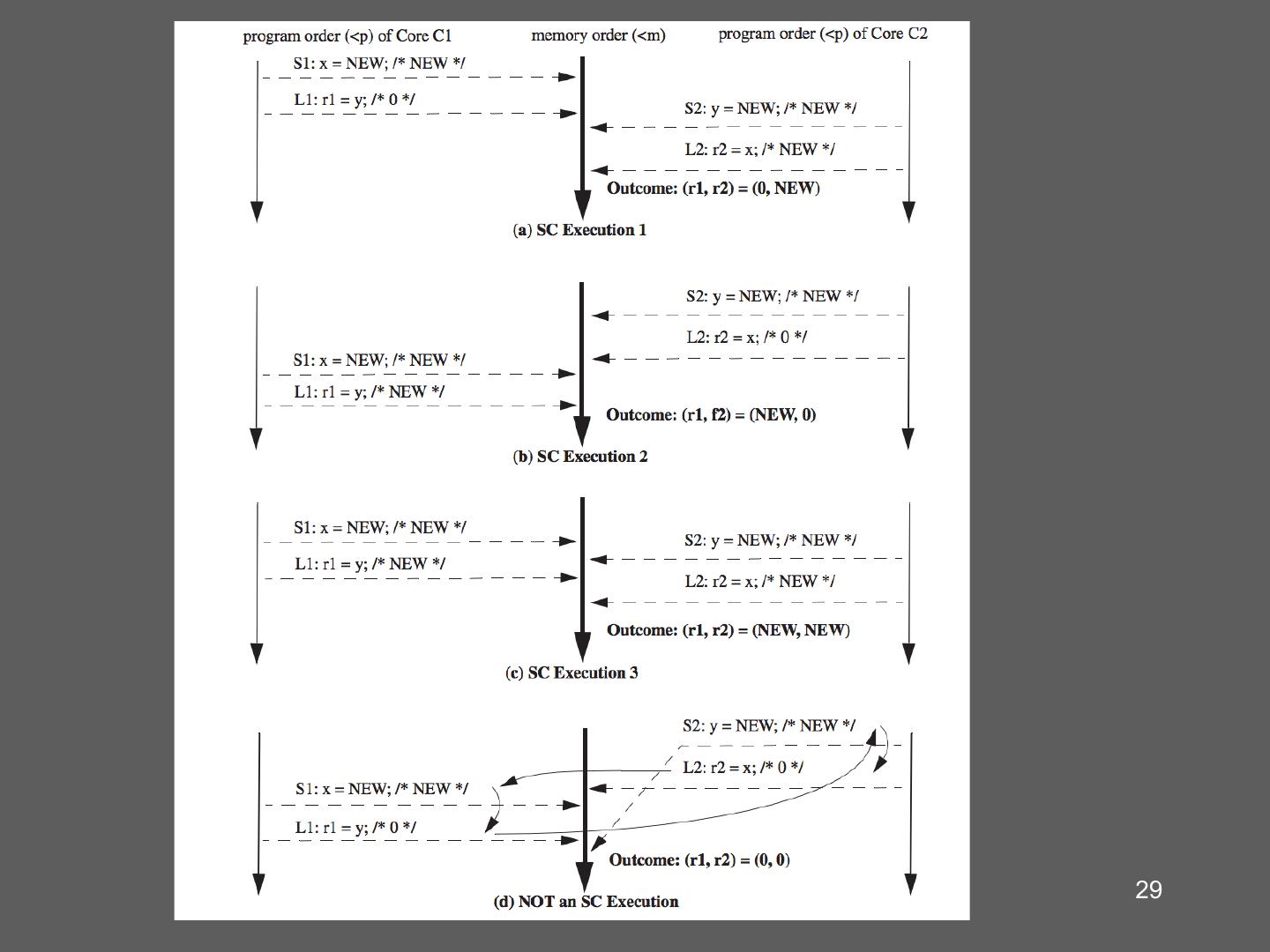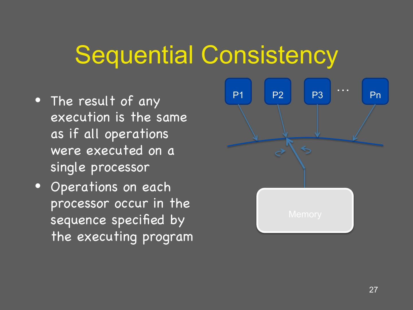 27 . Sequential Consistency … P1 P2 P3 Pn • The result of any execution is the same as if all operations were executed on a single processor • Operations on each processor occur in the Memory sequence specified by the executing program 27