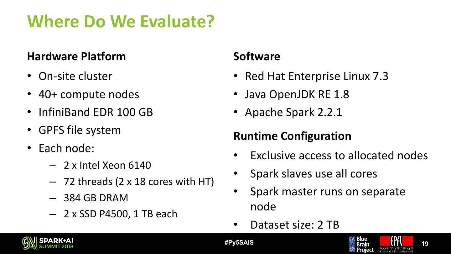 19 .Where Do We Evaluate? Hardware Platform Software • On-site cluster • Red Hat Enterprise Linux 7.3 • 40+ compute nodes • Java OpenJDK RE 1.8 • InfiniBand EDR 100 GB • Apache Spark 2.2.1 • GPFS file system Runtime Configuration • Each node: • Exclusive access to allocated nodes – 2 x Intel Xeon 6140 • Spark slaves use all cores – 72 threads (2 x 18 cores with HT) – 384 GB DRAM • Spark master runs on separate node – 2 x SSD P4500, 1 TB each • Dataset size: 2 TB #Py5SAIS 19