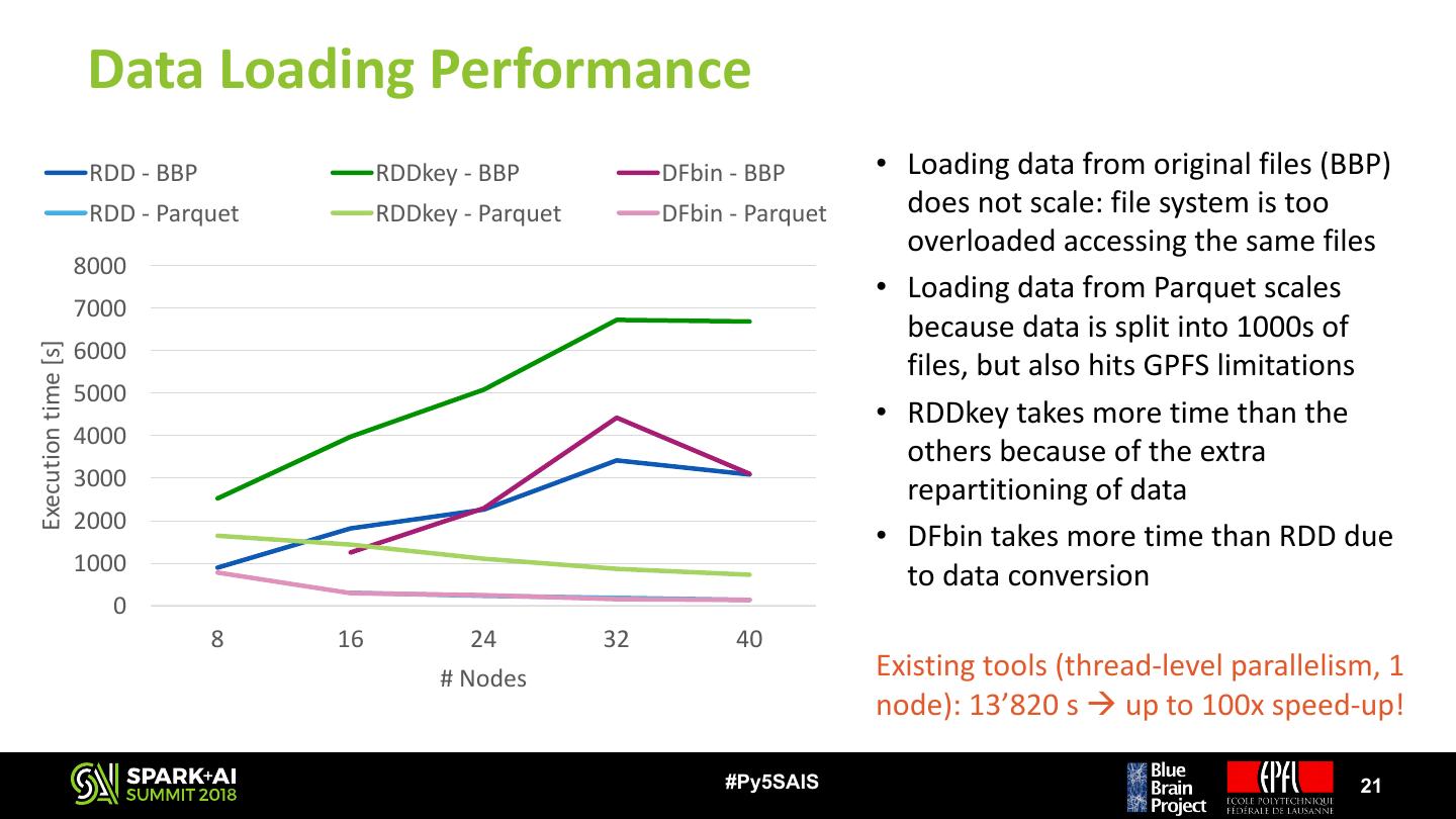 17 .Selected Combinations RDD RDDkey DFbin DFpylist Parallel RDD RDD DF DF structure Data Manual, based Automatic Automatic Automatic partitioning on GID Binary Data container NP array NP array Python list (byte array) • Data source is specified in the label: BBP (custom layout, binary) or Parquet #Py5SAIS 17