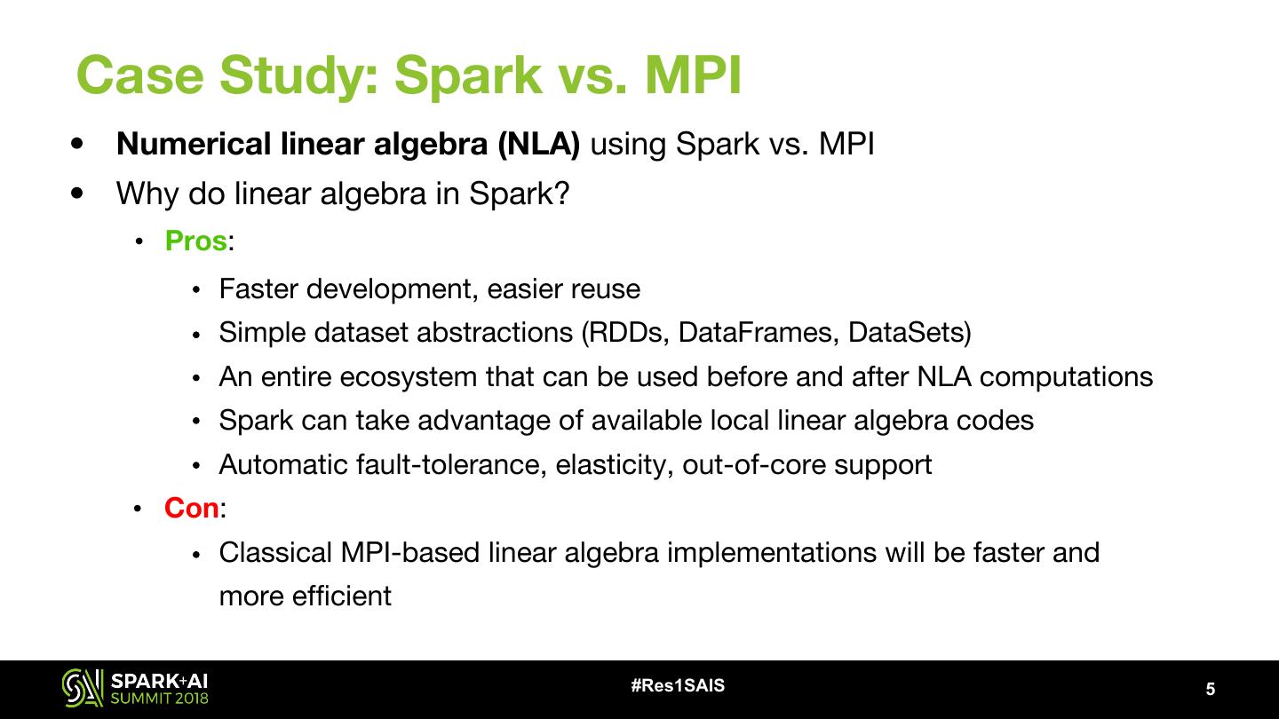 4 .Case Study: Spark vs. MPI • Numerical linear algebra (NLA) using Spark vs. MPI • Why do linear algebra in Spark? Spark for data-centric workloads and scientific analysis Characterization of linear algebra in Spark Customers demand Spark; want to understand performance concerns #Res1SAIS 4