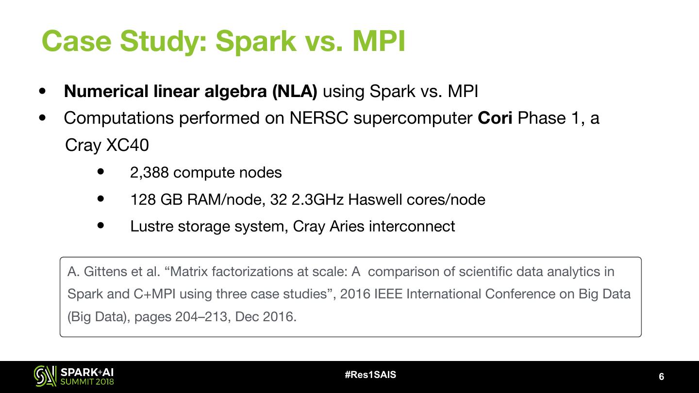 5 .Case Study: Spark vs. MPI • Numerical linear algebra (NLA) using Spark vs. MPI • Why do linear algebra in Spark? Pros: Faster development, easier reuse Simple dataset abstractions (RDDs, DataFrames, DataSets) An entire ecosystem that can be used before and after NLA computations Spark can take advantage of available local linear algebra codes Automatic fault-tolerance, elasticity, out-of-core support Con: Classical MPI-based linear algebra implementations will be faster and more efficient #Res1SAIS 5