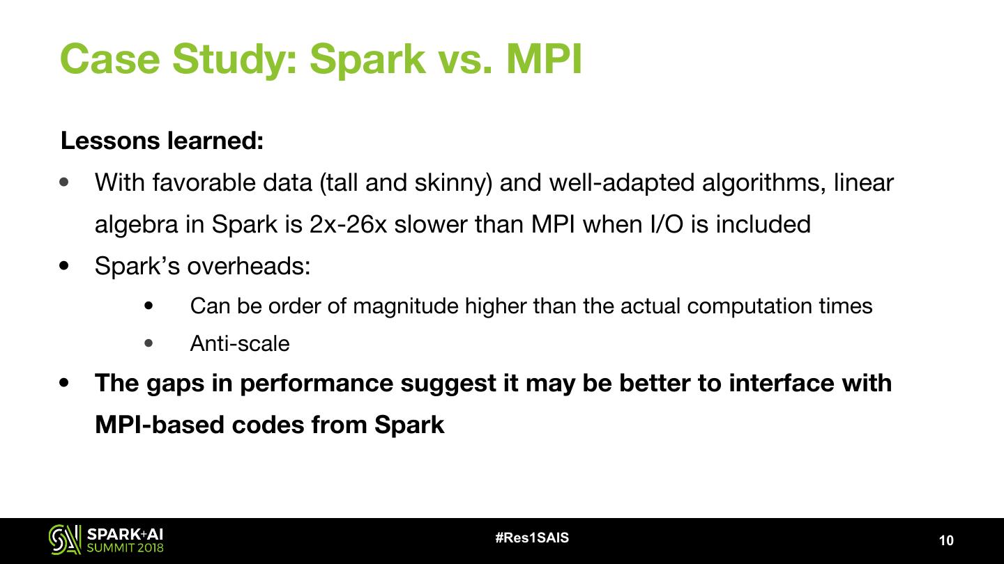 10 .Case Study: Spark vs. MPI Lessons learned: • With favorable data (tall and skinny) and well-adapted algorithms, linear algebra in Spark is 2x-26x slower than MPI when I/O is included • Spark’s overheads: • Can be order of magnitude higher than the actual computation times • Anti-scale • The gaps in performance suggest it may be better to interface with MPI-based codes from Spark #Res1SAIS 10
