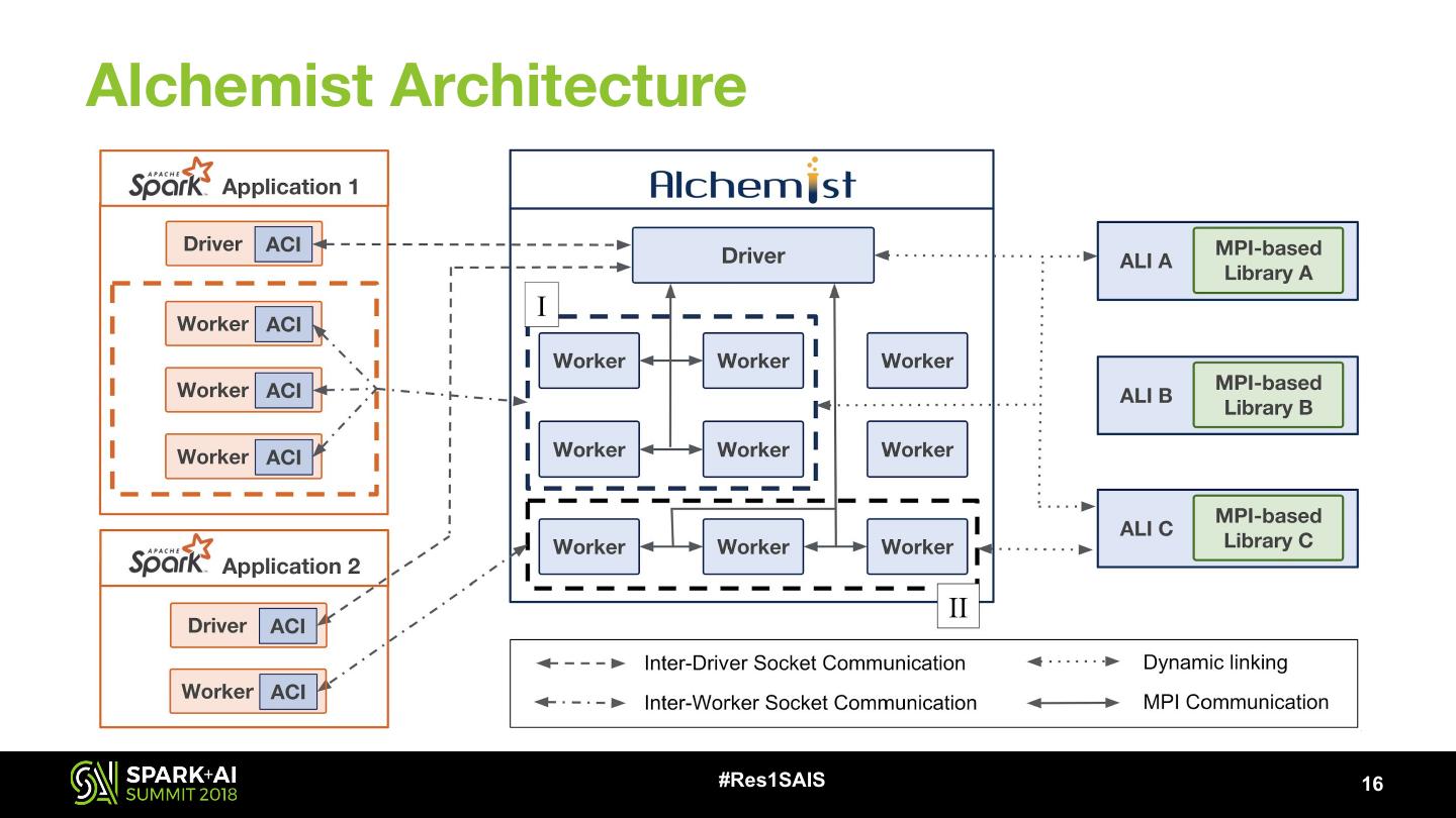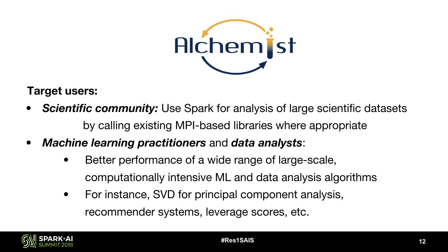 11 .• Alchemist interfaces between Apache Spark and existing or custom MPI-based libraries for large-scale linear algebra, machine learning, etc. • Idea: • Use Spark for regular data analysis workflow • When computationally intensive calculations are required, call relevant MPI-based codes from Spark using Alchemist, send results to Spark • Combine high productivity of Spark with high performance of MPI #Res1SAIS 11