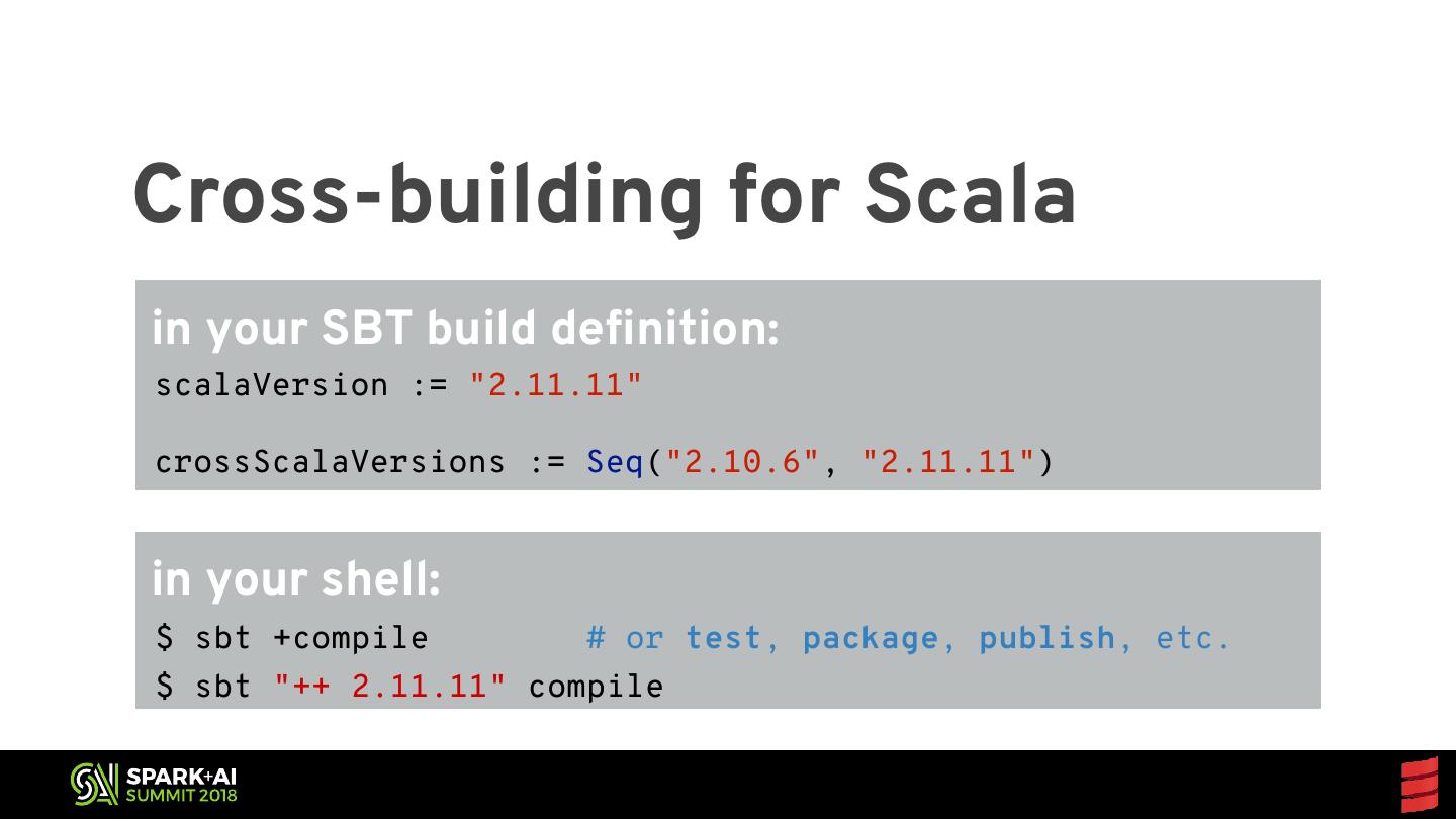 18 .Cross-building for Scala in your SBT build definition: scalaVersion := "2.11.11" crossScalaVersions := Seq("2.10.6", "2.11.11") in your shell: $ sbt +compile # or test, package, publish, etc. $ sbt "++ 2.11.11" compile