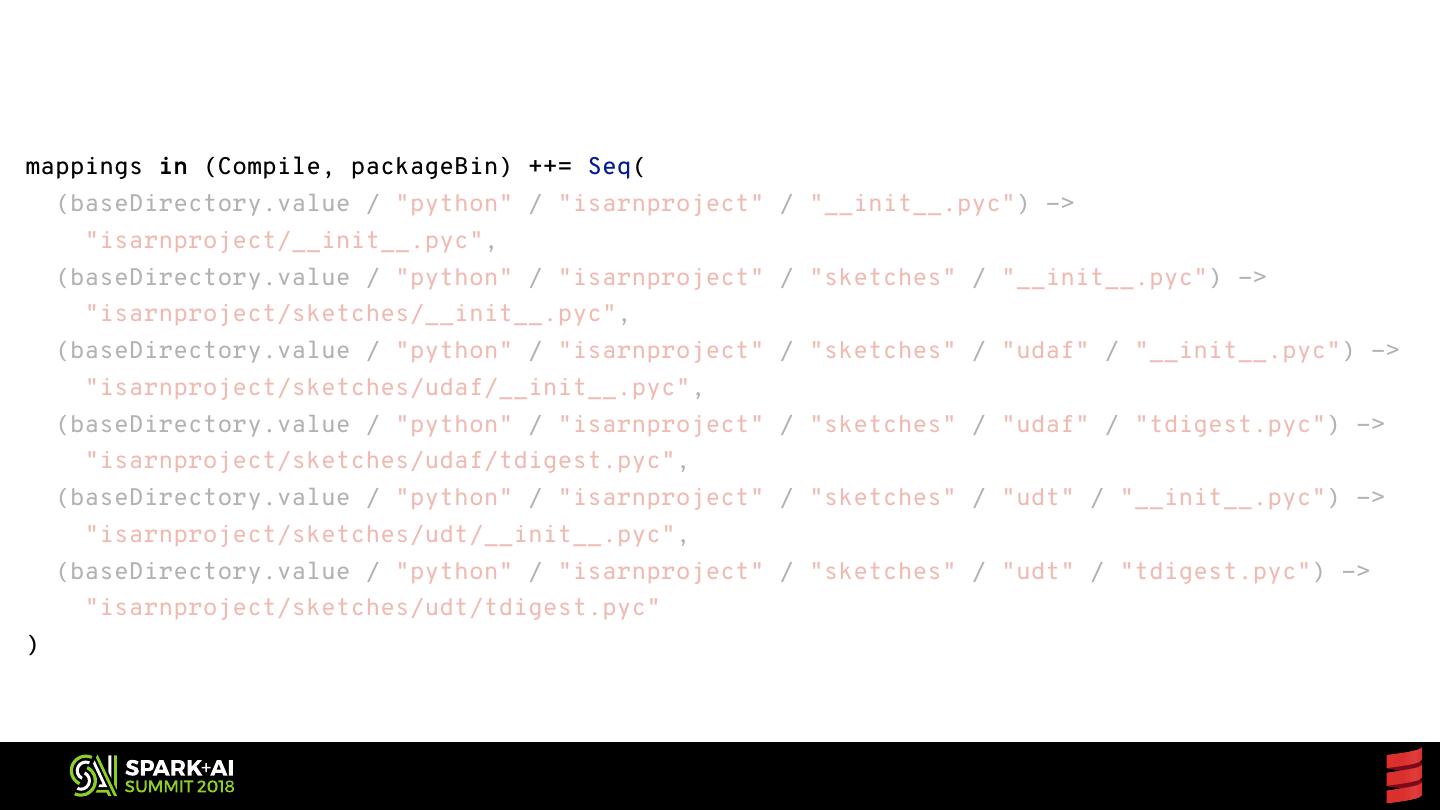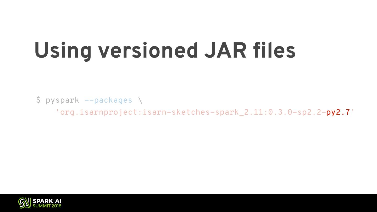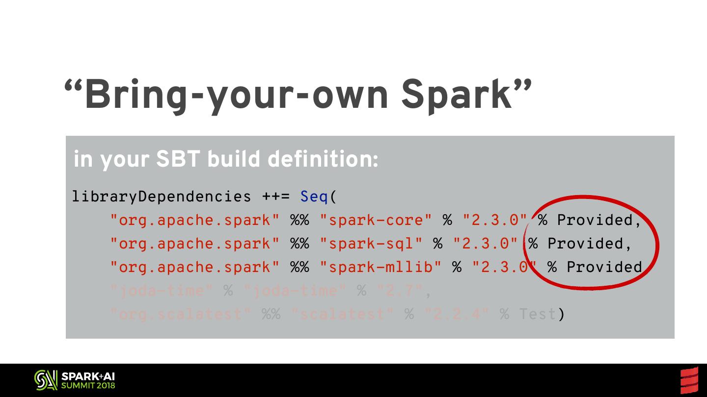 20 .“Bring-your-own Spark” in your SBT build definition: libraryDependencies ++= Seq( "org.apache.spark" %% "spark-core" % "2.3.0" % Provided, "org.apache.spark" %% "spark-sql" % "2.3.0" % Provided, "org.apache.spark" %% "spark-mllib" % "2.3.0" % Provided, "joda-time" % "joda-time" % "2.7", "org.scalatest" %% "scalatest" % "2.2.4" % Test)