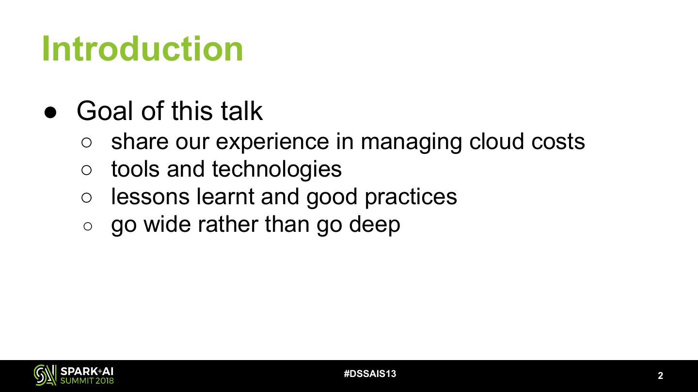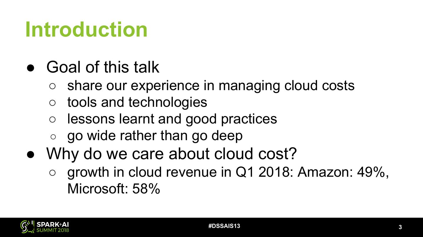 2 .Introduction ● Goal of this talk ○ share our experience in managing cloud costs ○ tools and technologies ○ lessons learnt and good practices ○ go wide rather than go deep #DSSAIS13 2