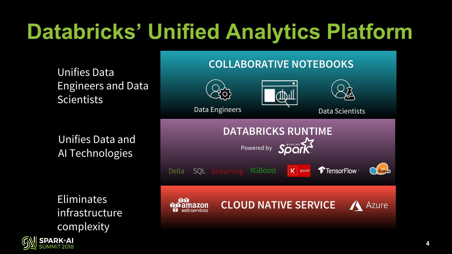4 .Databricks’ Unified Analytics Platform COLLABORATIVE NOTEBOOKS Unifies Data Engineers and Data Scientists Data Engineers Data Scientists DATABRICKS RUNTIME Unifies Data and Powered by AI Technologies Delta SQL Streaming XGBoost Eliminates CLOUD NATIVE SERVICE infrastructure complexity 4