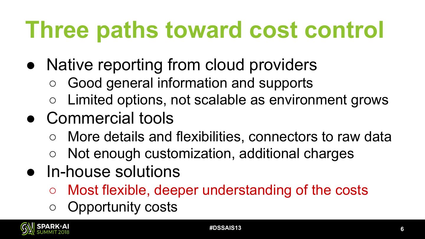 5 .Three paths toward cost control ● Native reporting from cloud providers ○ Good general information and supports ○ Limited options, not scalable as environment grows ● Commercial tools ○ More details and flexibilities, connectors to raw data ○ Not enough customization, additional charges #DSSAIS13 5