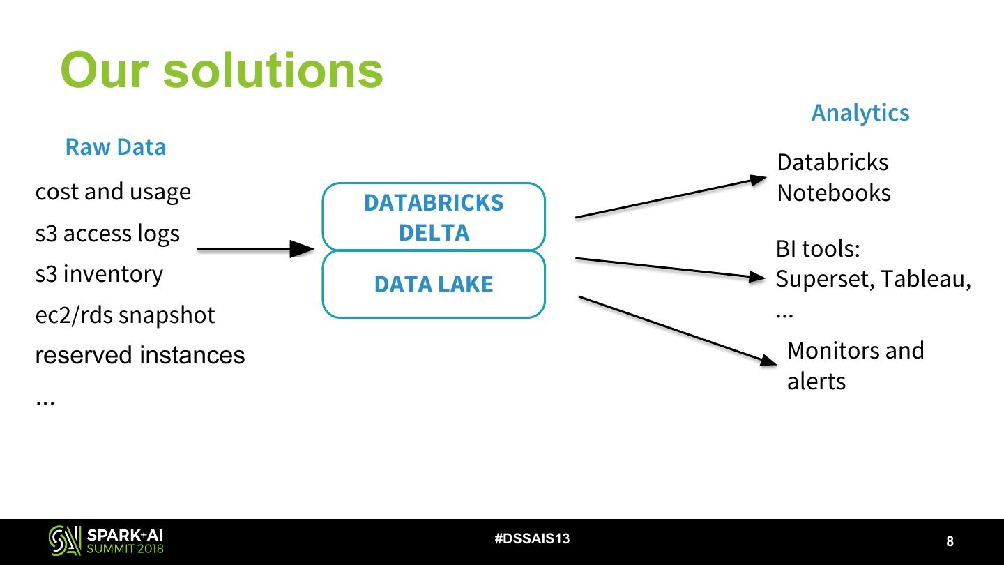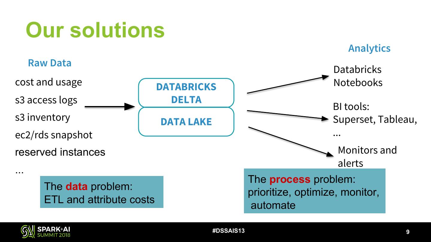 8 . Our solutions Analytics Raw Data Databricks cost and usage DATABRICKS Notebooks s3 access logs DELTA BI tools: s3 inventory DATA LAKE Superset, Tableau, ec2/rds snapshot ... reserved instances Monitors and alerts ... #DSSAIS13 8