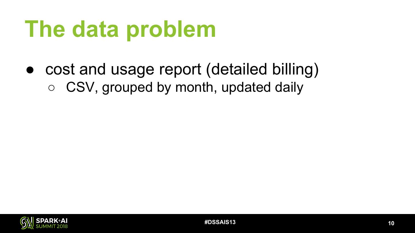 10 .The data problem ● cost and usage report (detailed billing) ○ CSV, grouped by month, updated daily #DSSAIS13 10