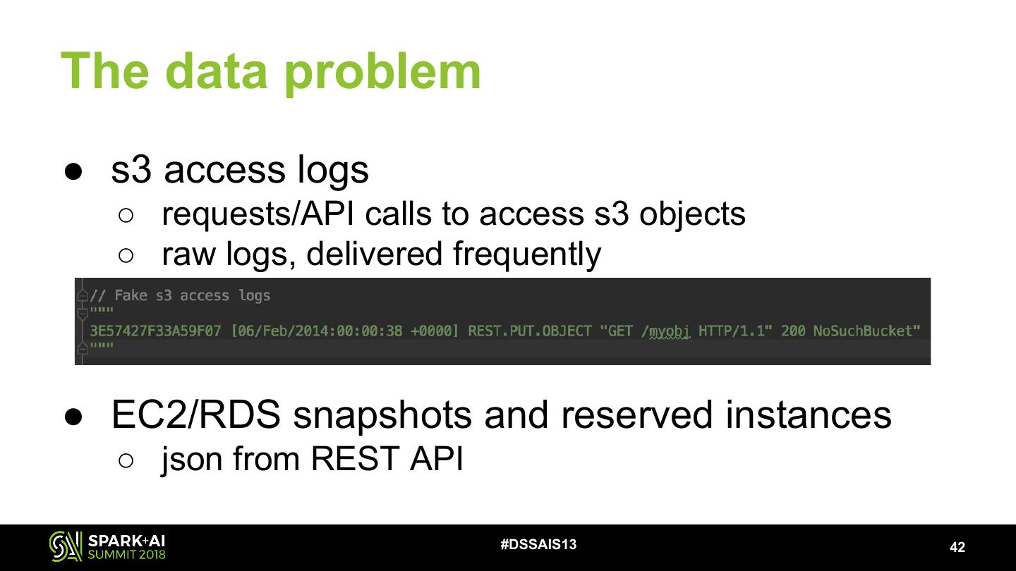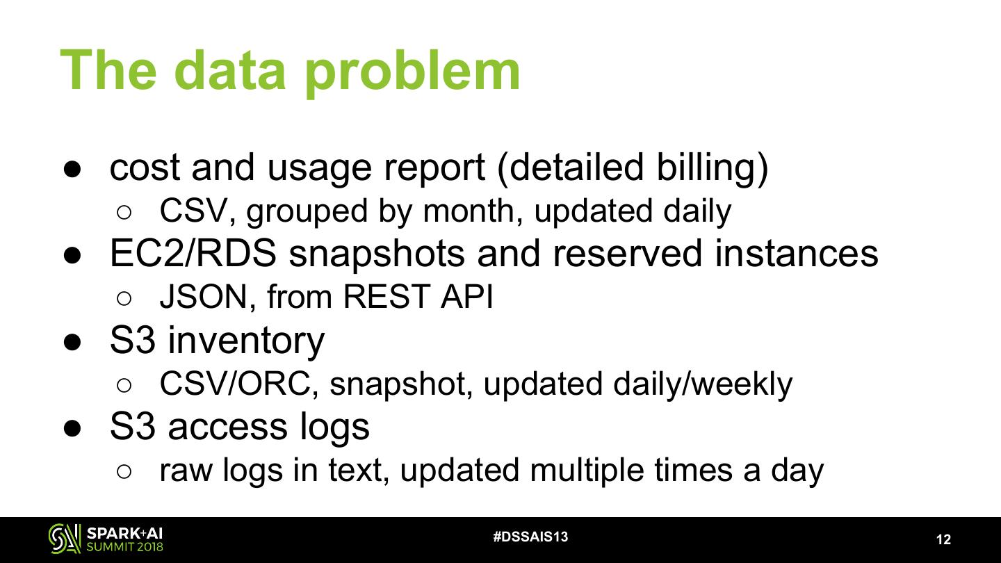 12 .The data problem ● cost and usage report (detailed billing) ○ CSV, grouped by month, updated daily ● EC2/RDS snapshots and reserved instances ○ JSON, from REST API ● S3 inventory ○ CSV/ORC, snapshot, updated daily/weekly ● S3 access logs ○ raw logs in text, updated multiple times a day #DSSAIS13 12