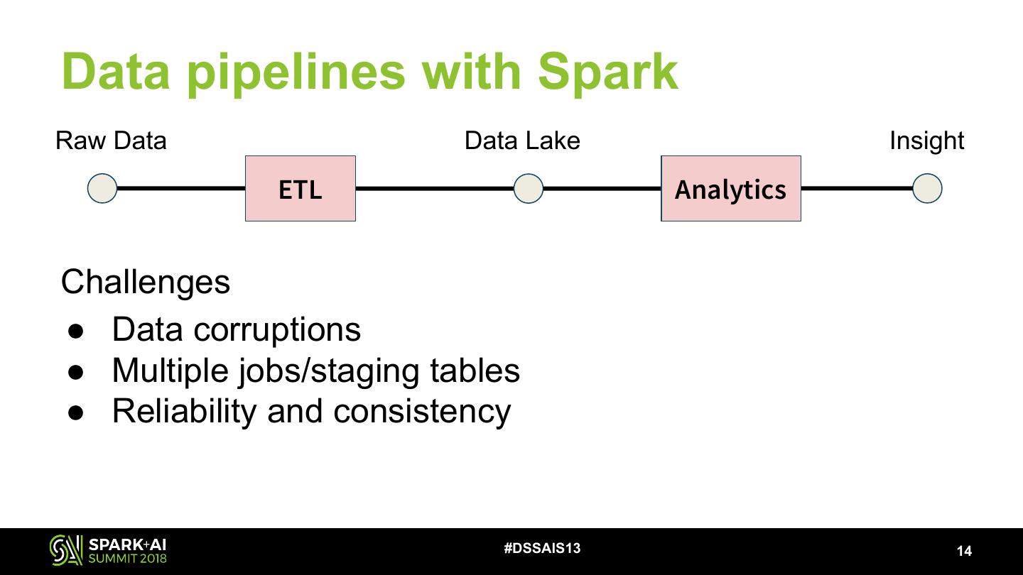 14 .Data pipelines with Spark Raw Data Data Lake Insight ETL Analytics Challenges ● Data corruptions ● Multiple jobs/staging tables ● Reliability and consistency #DSSAIS13 14