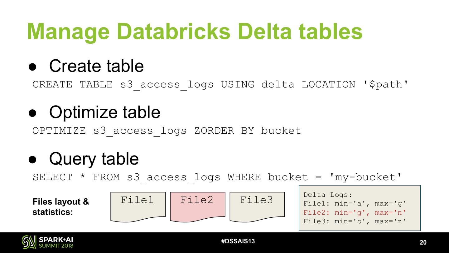 19 .Manage Databricks Delta tables ● Create table CREATE TABLE s3_access_logs USING delta LOCATION '$path' ● Optimize table OPTIMIZE s3_access_logs ZORDER BY bucket #DSSAIS13 19