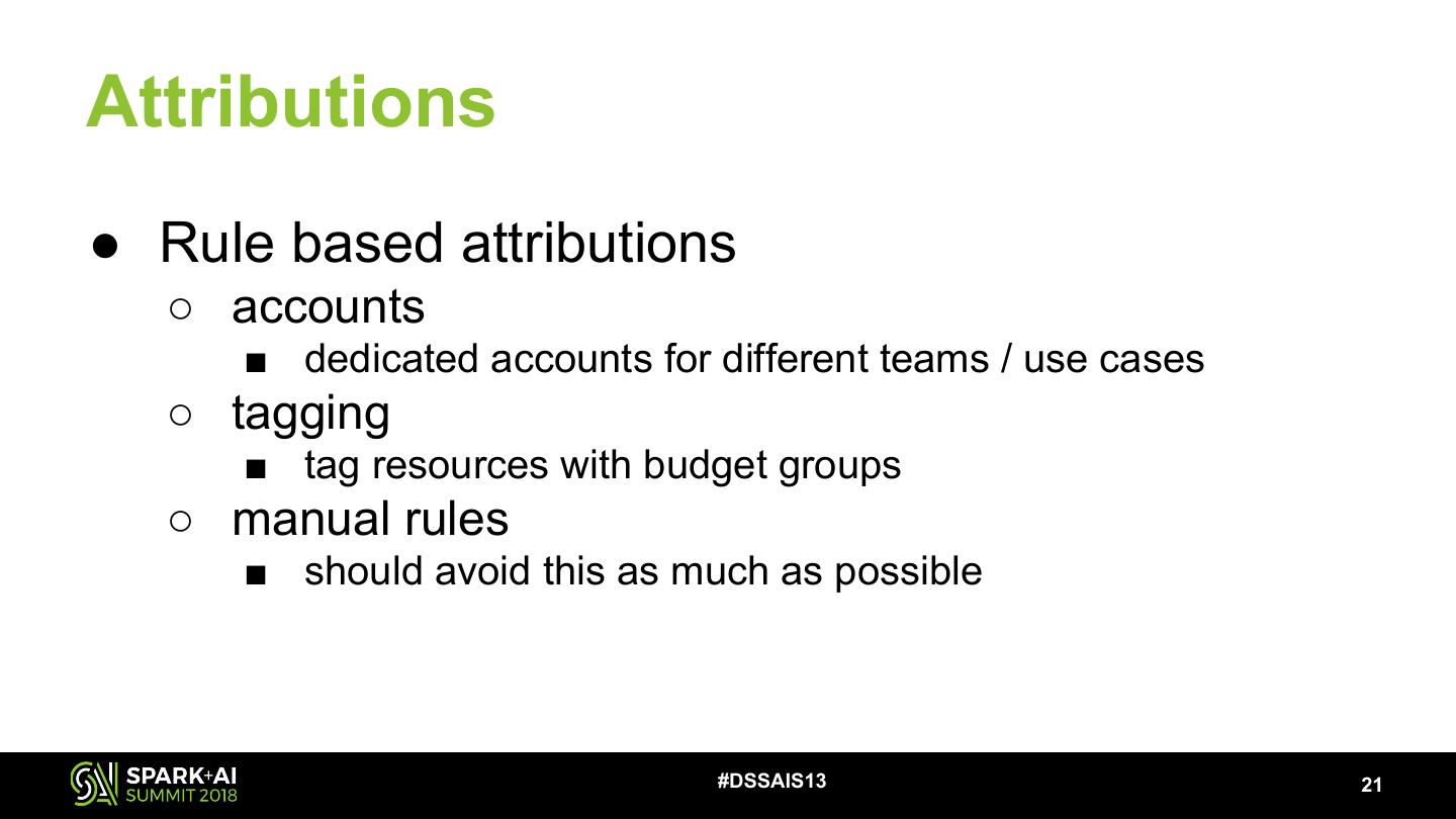 21 .Attributions ● Rule based attributions ○ accounts ■ dedicated accounts for different teams / use cases ○ tagging ■ tag resources with budget groups ○ manual rules ■ should avoid this as much as possible #DSSAIS13 21