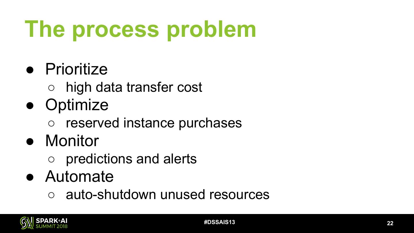 22 .The process problem ● Prioritize ○ high data transfer cost ● Optimize ○ reserved instance purchases ● Monitor ○ predictions and alerts ● Automate ○ auto-shutdown unused resources #DSSAIS13 22