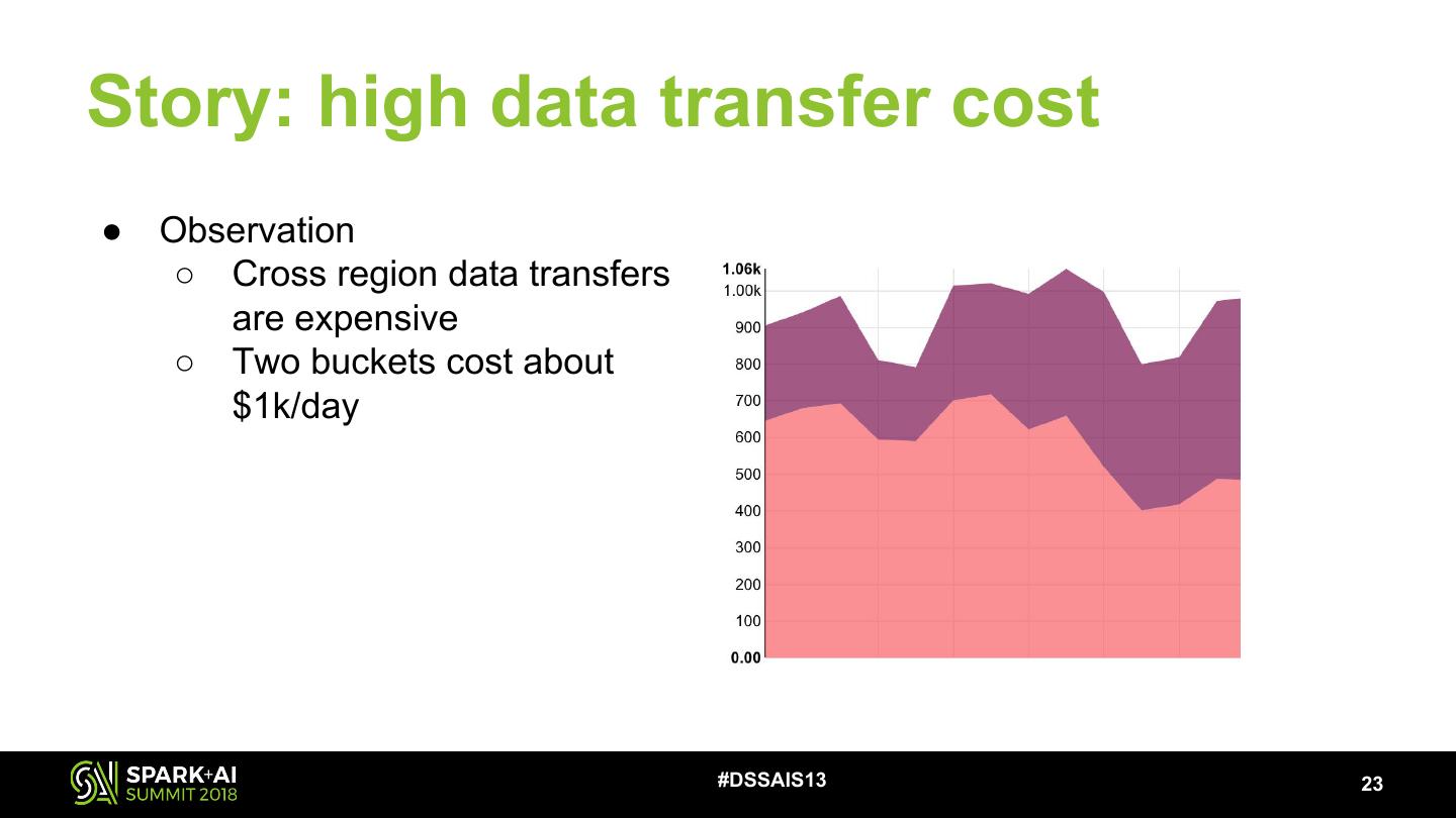 23 .Story: high data transfer cost ● Observation ○ Cross region data transfers are expensive ○ Two buckets cost about $1k/day #DSSAIS13 23