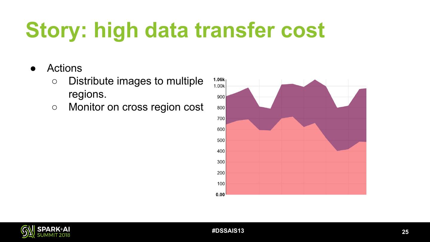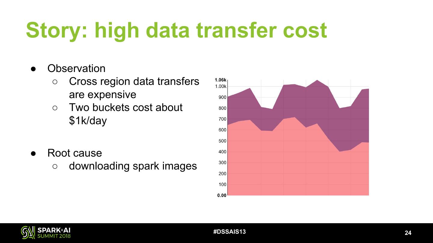 24 .Story: high data transfer cost ● Observation ○ Cross region data transfers are expensive ○ Two buckets cost about $1k/day ● Root cause ○ downloading spark images #DSSAIS13 24