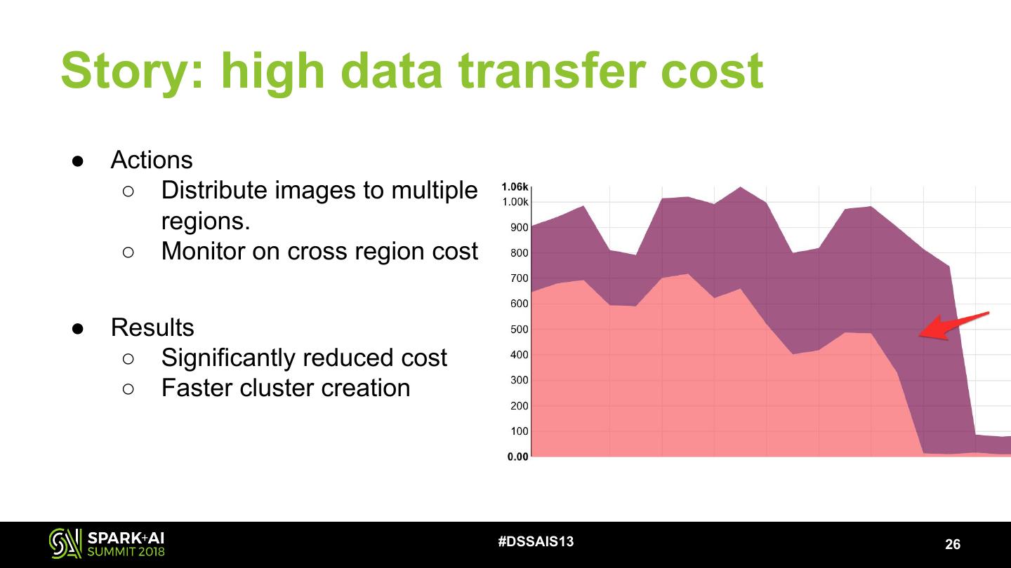 26 .Story: high data transfer cost ● Actions ○ Distribute images to multiple regions. ○ Monitor on cross region cost ● Results ○ Significantly reduced cost ○ Faster cluster creation #DSSAIS13 26