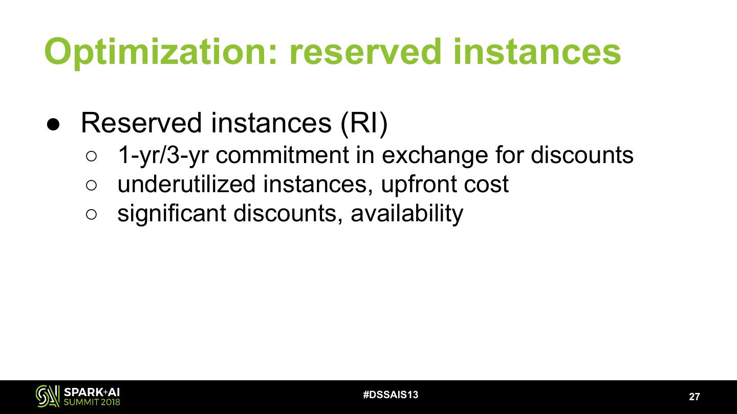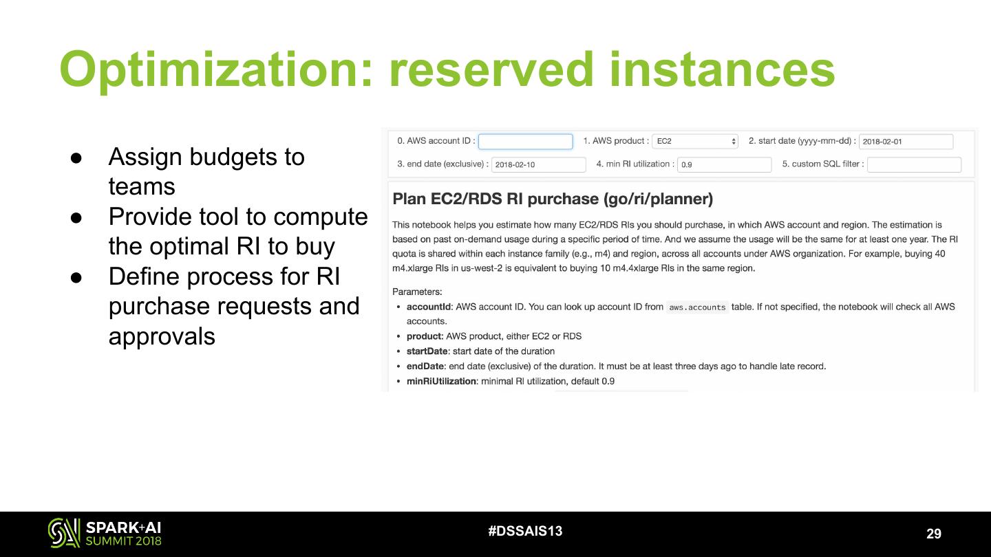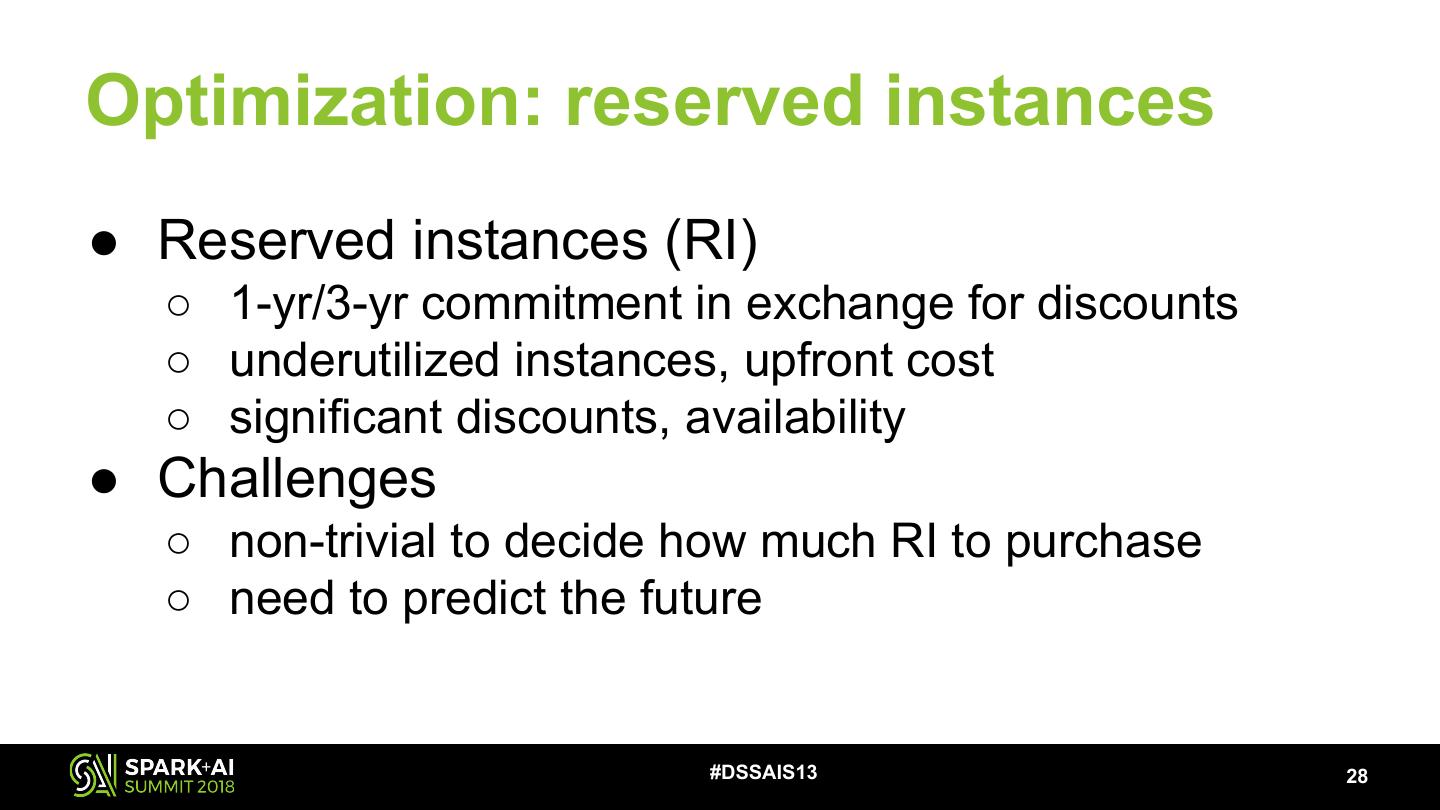 28 .Optimization: reserved instances ● Reserved instances (RI) ○ 1-yr/3-yr commitment in exchange for discounts ○ underutilized instances, upfront cost ○ significant discounts, availability ● Challenges ○ non-trivial to decide how much RI to purchase ○ need to predict the future #DSSAIS13 28