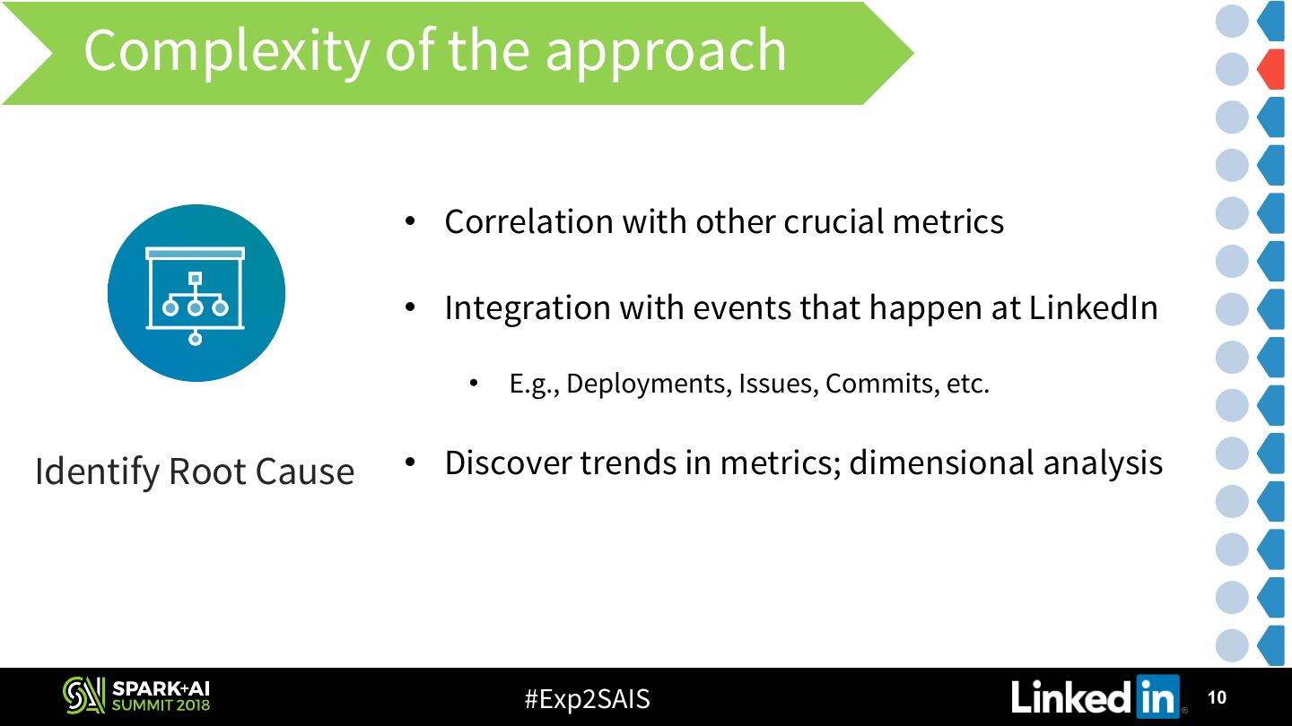 10 . Complexity of the approach • Correlation with other crucial metrics • Integration with events that happen at LinkedIn • E.g., Deployments, Issues, Commits, etc. Identify Root Cause • Discover trends in metrics; dimensional analysis #Exp2SAIS 10