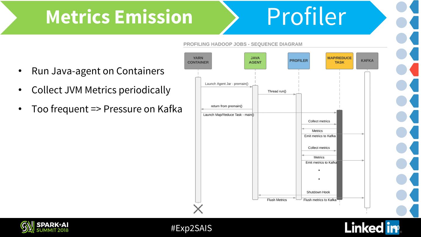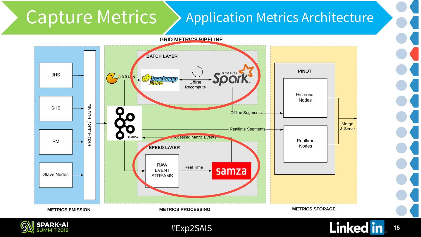 14 .Application Metrics Architecture Emission • Hadoop Metrics • Counters – Parse Job History files & emit to Kafka using Flume • JVM Metrics – Launch a java-agent & emit metrics to Kafka • Spark Metrics • Status API V1 metrics – Rest API of Spark History Server • JVM Metrics – “Spark Metrics System” • Derived Metrics • Resource & Time metrics - Parse RM logs using Flume & emit to Kafka #Exp2SAIS 14