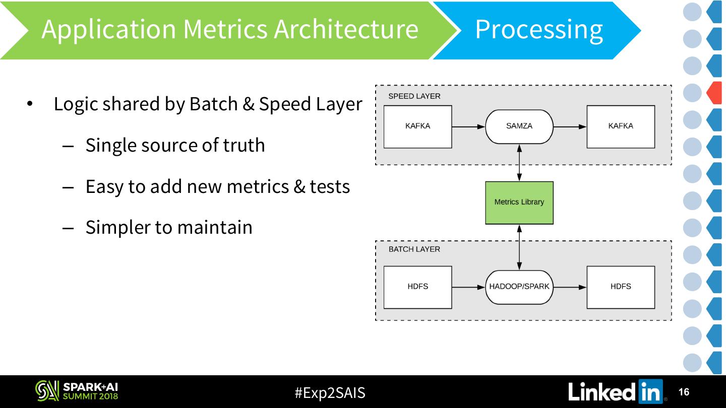 16 . Application Metrics Architecture Processing • Logic shared by Batch & Speed Layer – Single source of truth – Easy to add new metrics & tests – Simpler to maintain #Exp2SAIS 16