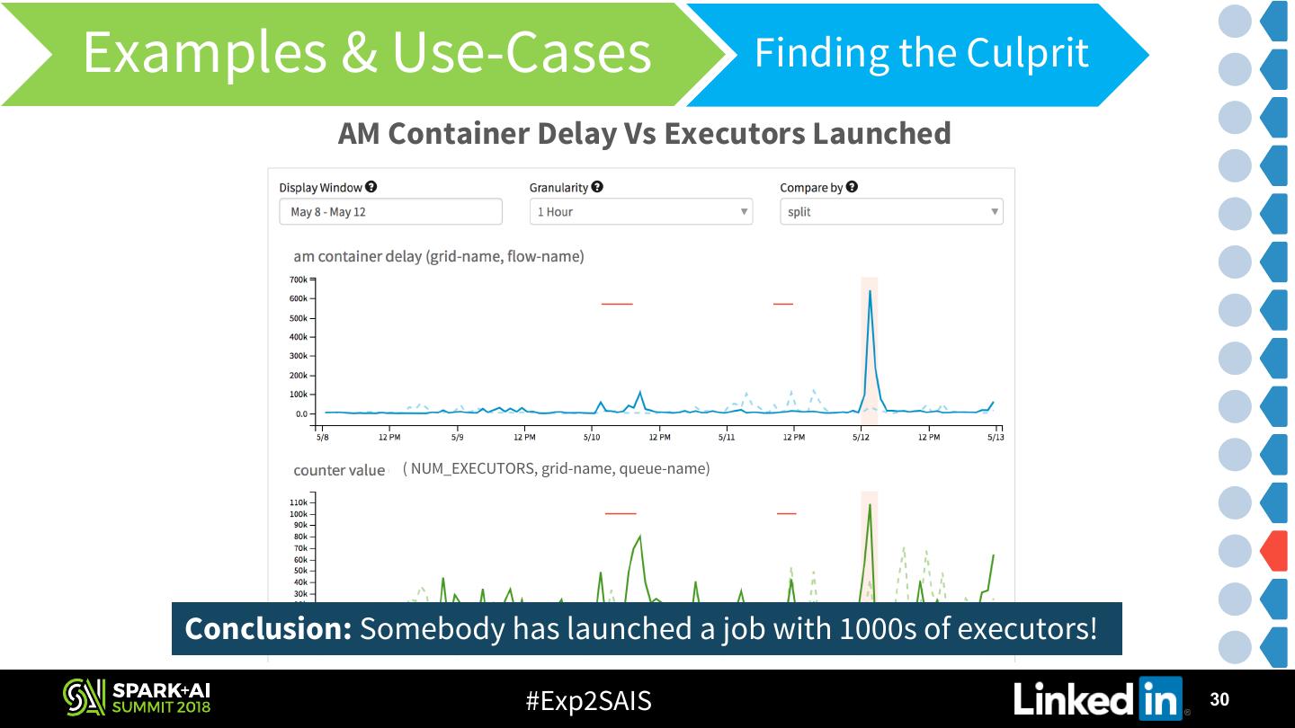 29 .Examples & Use-Cases Finding the Culprit AM Container Delay Vs Queue Resource Usage Conclusion: Looks like the queue was operating at its peak load #Exp2SAIS 29