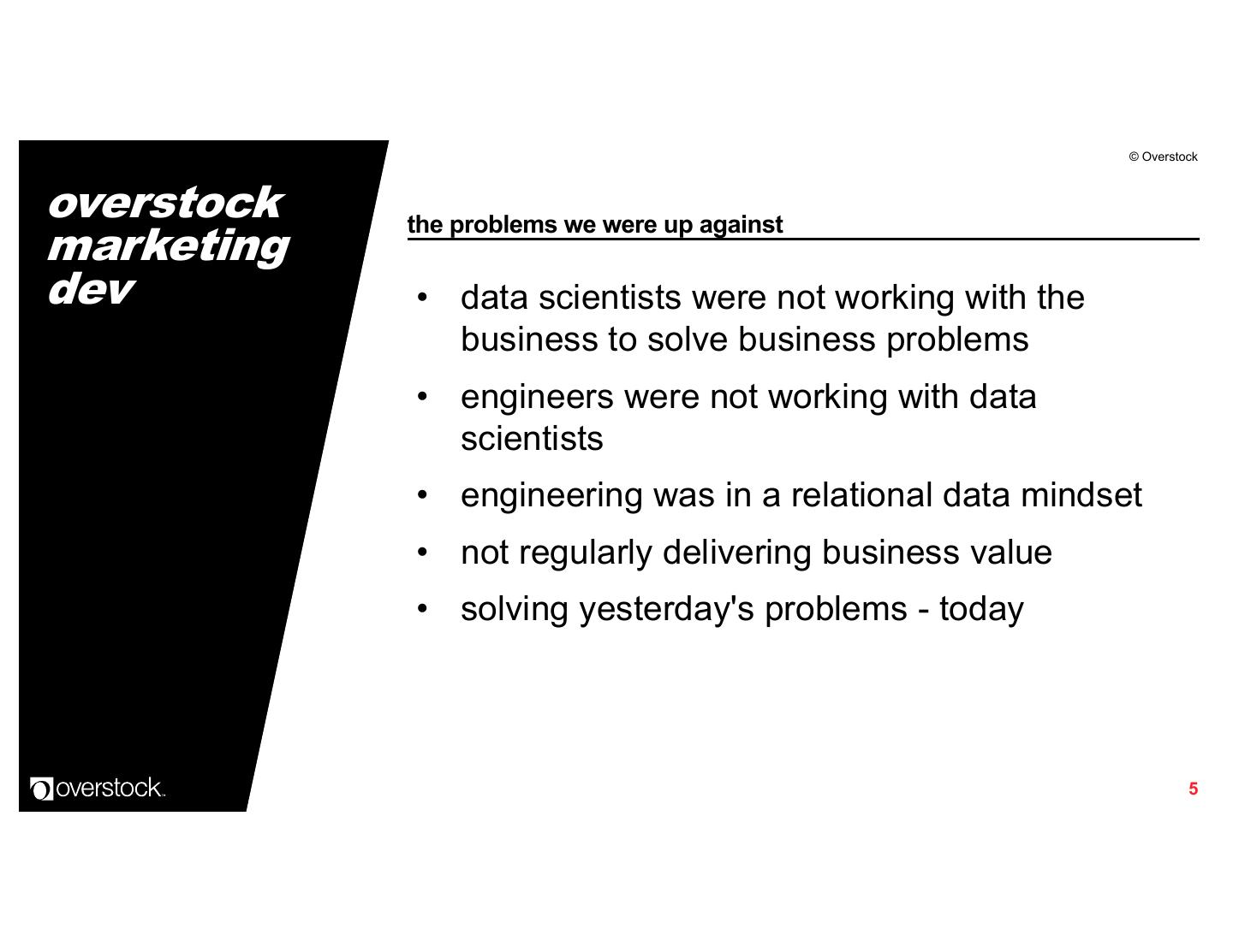 4 . © Overstock overstock marketing the problems we were up against dev • data scientists were not working with the business to solve business problems • engineers were not working with data scientists • engineering was in a relational data mindset • not regularly delivering business value • solving yesterday's problems - today 5