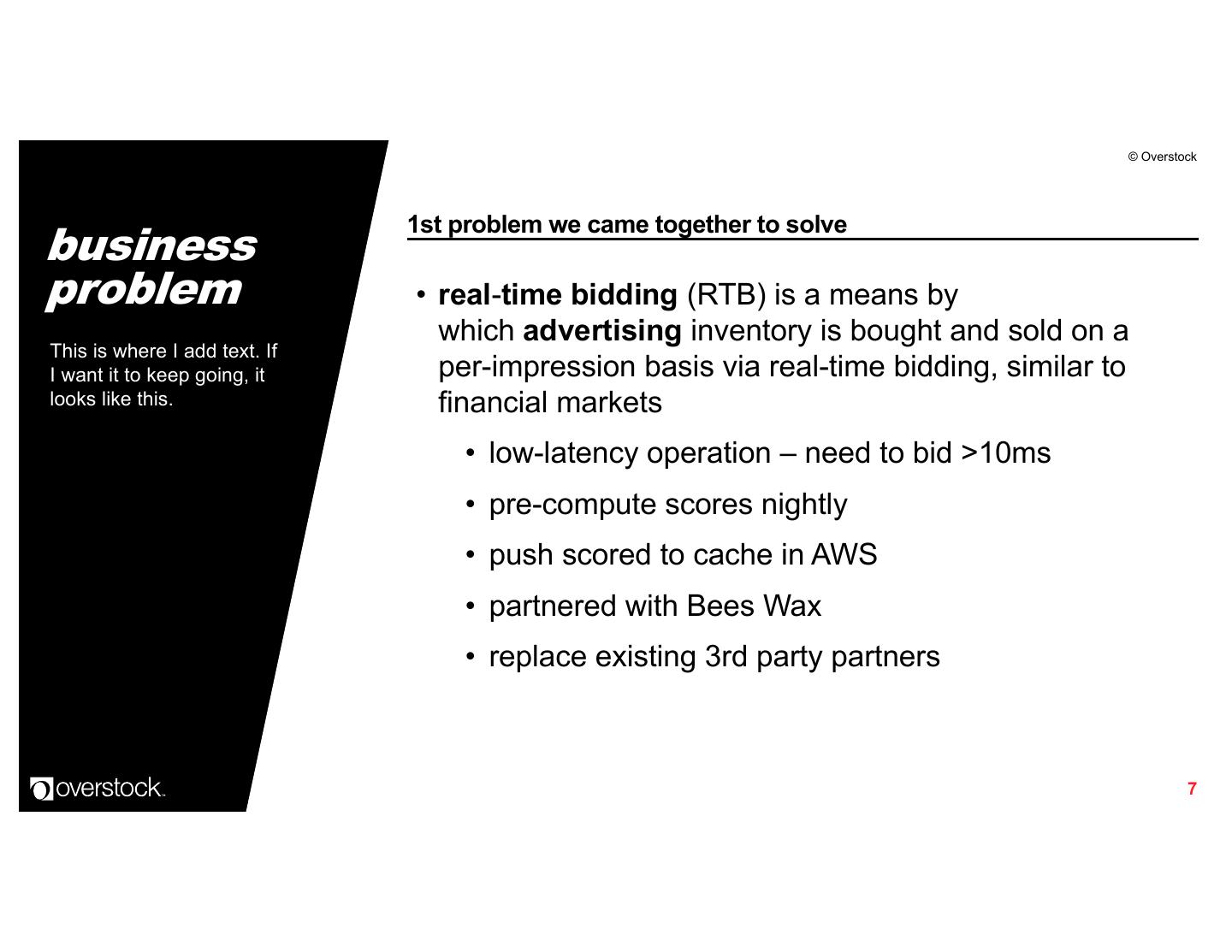 6 . © Overstock business 1st problem we came together to solve problem • real-time bidding (RTB) is a means by which advertising inventory is bought and sold on a This is where I add text. If I want it to keep going, it per-impression basis via real-time bidding, similar to looks like this. financial markets • low-latency operation – need to bid >10ms • pre-compute scores nightly • push scored to cache in AWS • partnered with Bees Wax • replace existing 3rd party partners 7