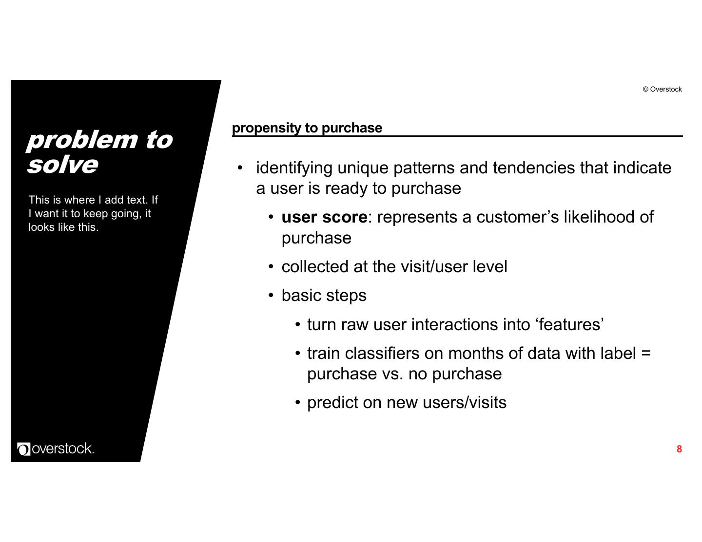 7 . © Overstock problem to propensity to purchase solve • identifying unique patterns and tendencies that indicate a user is ready to purchase This is where I add text. If I want it to keep going, it looks like this. • user score: represents a customer’s likelihood of purchase • collected at the visit/user level • basic steps • turn raw user interactions into ‘features’ • train classifiers on months of data with label = purchase vs. no purchase • predict on new users/visits 8
