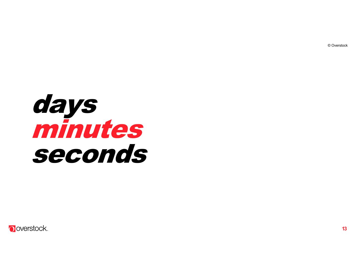 11 . © Overstock Faster Scotty recap what we accomplished in 6 months • we were solving today's problems... by the end of the day • engineering was thinking about streaming data • had the pieces in place to start scoring users in minutes 12