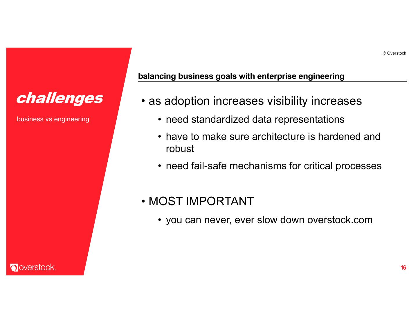 15 . © Overstock balancing business goals with enterprise engineering challenges • as adoption increases visibility increases business vs engineering • need standardized data representations • have to make sure architecture is hardened and robust • need fail-safe mechanisms for critical processes • MOST IMPORTANT • you can never, ever slow down overstock.com 16